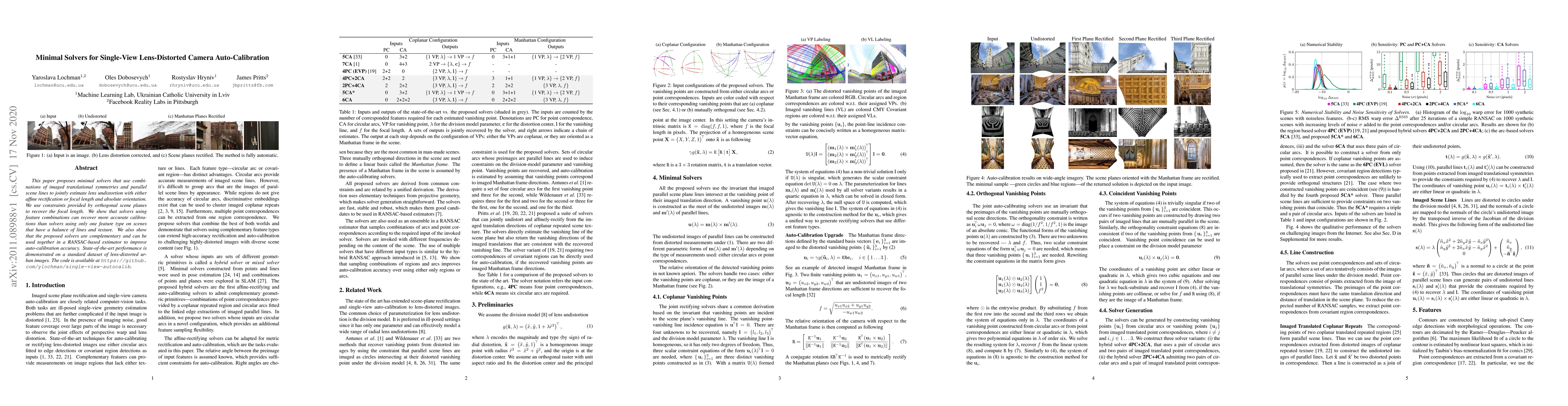 This paper introduces minimal solvers for auto-calibration of single-view lens-distorted cameras, leveraging imaged symmetries and parallel lines to estimate undistortion and orientation. The proposed solvers achieve better calibration accuracy by combining different feature types and are shown to improve performance when used together in a RANSAC framework.