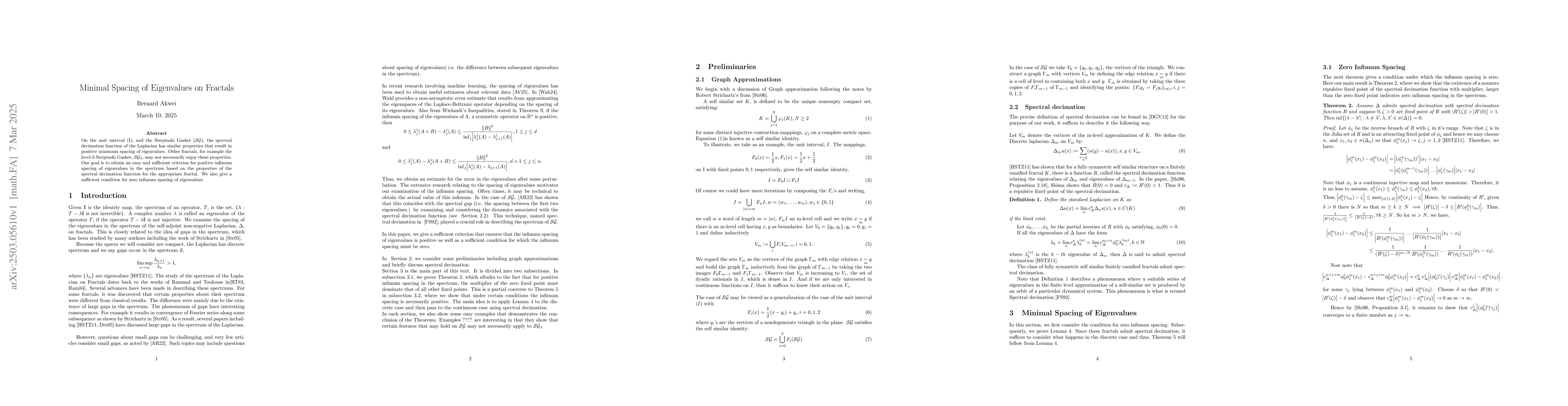 The paper introduces a new approach to analyzing eigenvalue spacing on fractals using spectral decimation functions, providing both conditions for positive and zero infimum spacing.