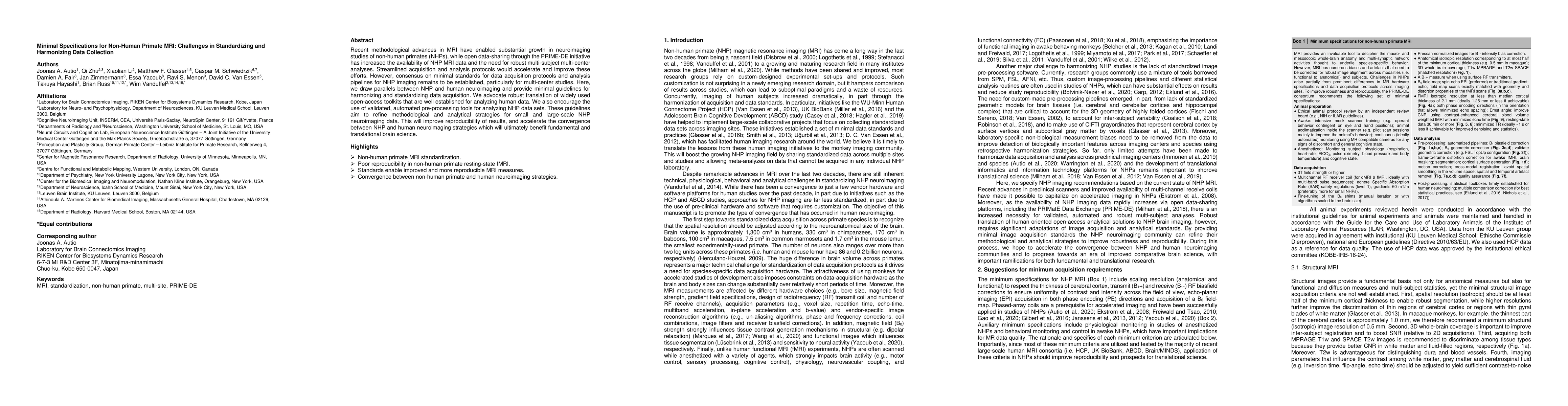 This paper highlights the need for standardized MRI data acquisition and analysis protocols in non-human primate (NHP) neuroimaging studies. It proposes minimal guidelines, inspired by human neuroimaging, to improve reproducibility and facilitate convergence with human neuroimaging strategies, benefiting both fundamental and translational brain science.