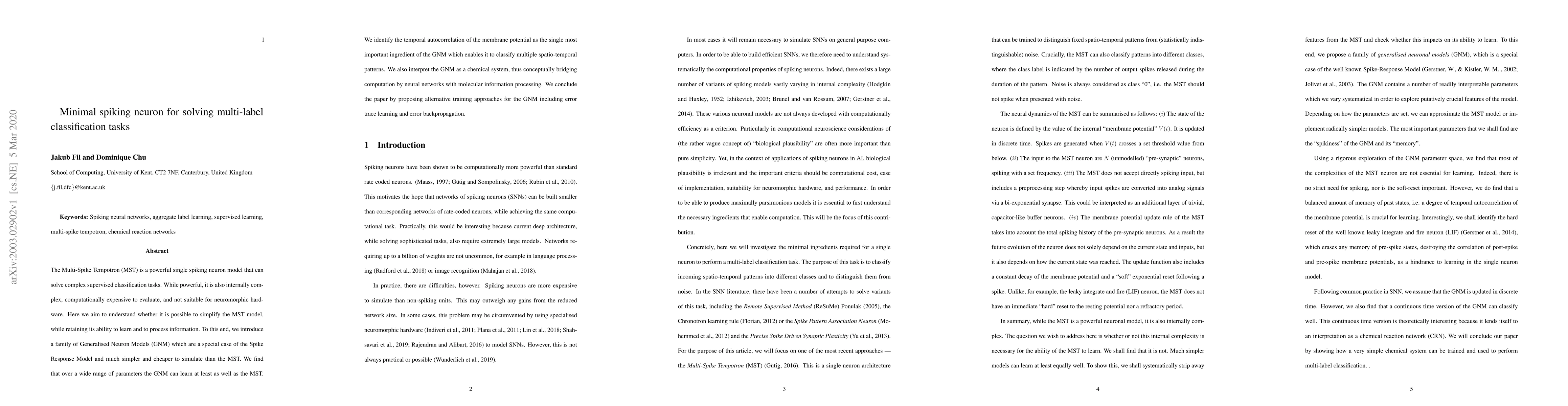 The Multi-Spike Tempotron (MST) is a powerful single spiking neuron model that can solve complex supervised classification tasks. While powerful, it is also internally complex, computationally expensive to evaluate, and not suitable for neuromorphic hardware. Here we aim to understand whether it is possible to simplify the MST model, while retaining its ability to learn and to process information. To this end, we introduce a family of Generalised Neuron Models (GNM) which are a special case of the Spike Response Model and much simpler and cheaper to simulate than the MST. We find that over a wide range of parameters the GNM can learn at least as well as the MST. We identify the temporal autocorrelation of the membrane potential as the single most important ingredient of the GNM which enables it to classify multiple spatio-temporal patterns. We also interpret the GNM as a chemical system, thus conceptually bridging computation by neural networks with molecular information processing. We conclude the paper by proposing alternative training approaches for the GNM including error trace learning and error backpropagation.