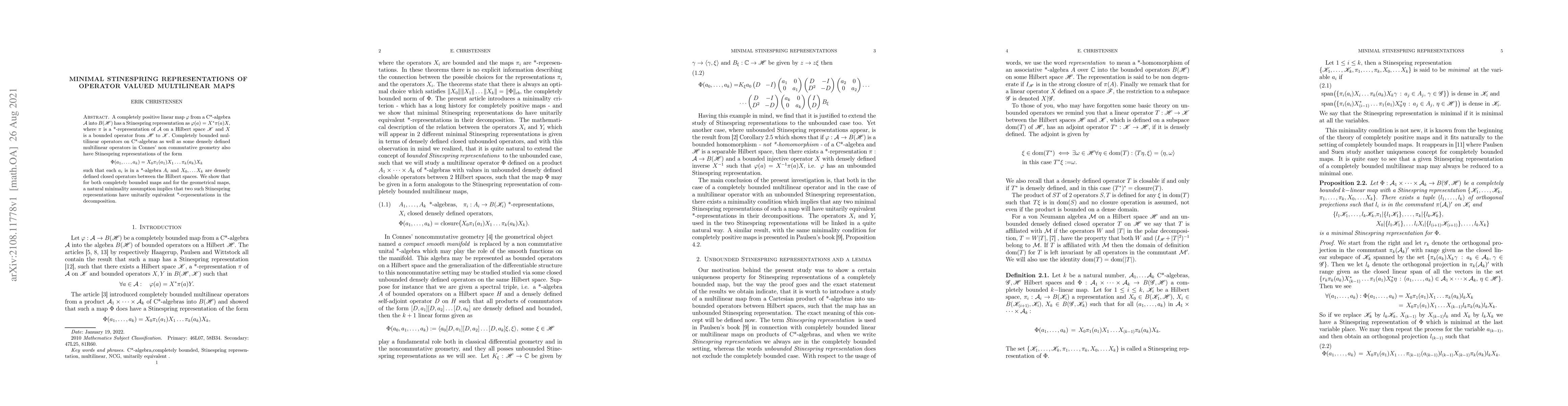 A completely positive linear map $\varphi$ from a C*-algebra $A$ into $B(H)$ has a Stinespring representation as $\varphi(a) = X^*\pi(a)X,$ where $\pi$ is a *-representation of $A$ on a Hilbert space $K$ and $X$ is a bounded operator from $H$ to $K. $ Completely bounded multilinear operators on C*-algebras as well as some densely defined multilinear operators in Connes' non commutative geometry also have Stinespring representations of the form $$ \Phi(a_1, \dots, a_k ) = X_0\pi_1(a_1)X_1 \dots \pi_k(a_k)X_k$$ such that each $a_i$ is in a *-algebra $A_i$ and $X_0, \dots X_k $ are densely defined closed operators between the Hilbert spaces. We show that for both completely bounded maps and for the geometrical maps, a natural minimality assumption implies that two such Stinespring representations have unitarily equivalent *-representations in the decomposition.