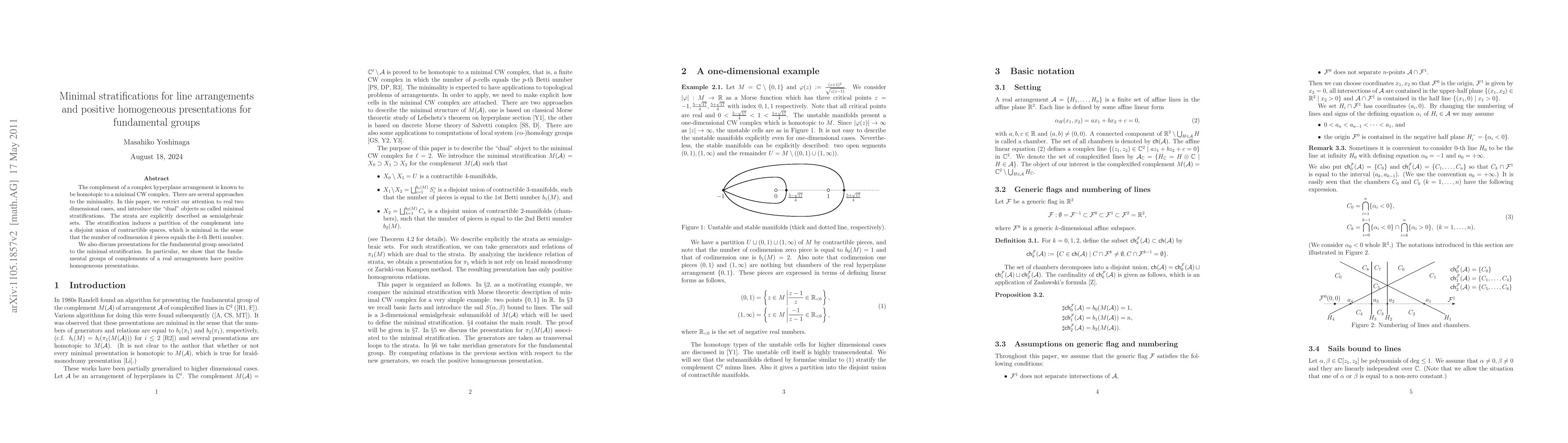 This paper examines minimal stratifications for real two-dimensional line arrangements, describing strata as semialgebraic sets. It proves that these stratifications partition the complement into minimal contractible regions, with the number of regions matching the Betti numbers. Additionally, it provides positive homogeneous presentations for the fundamental groups of these arrangement complements.