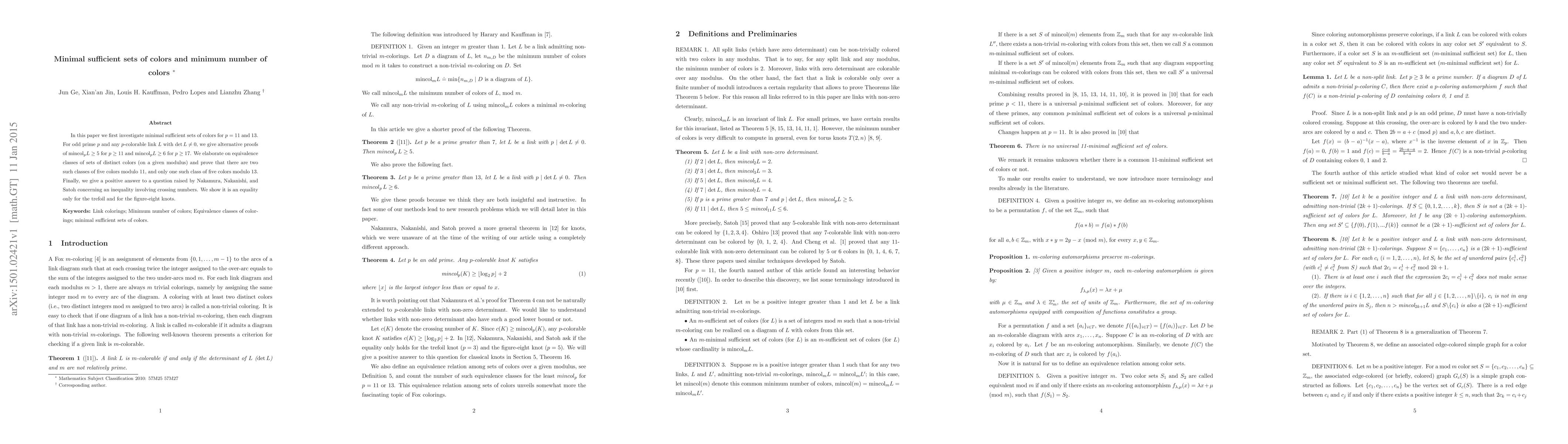 This paper explores minimal sufficient sets of colors for primes p=11 and 13, proving that for p-colorable links with non-zero determinant, the minimum number of colors required is at least 5 for p ≥ 11 and at least 6 for p ≥ 17. It also confirms two equivalence classes of five colors modulo 11 and one such class modulo 13, and resolves an inequality involving crossing numbers, showing equality only for the trefoil and figure-eight knots.