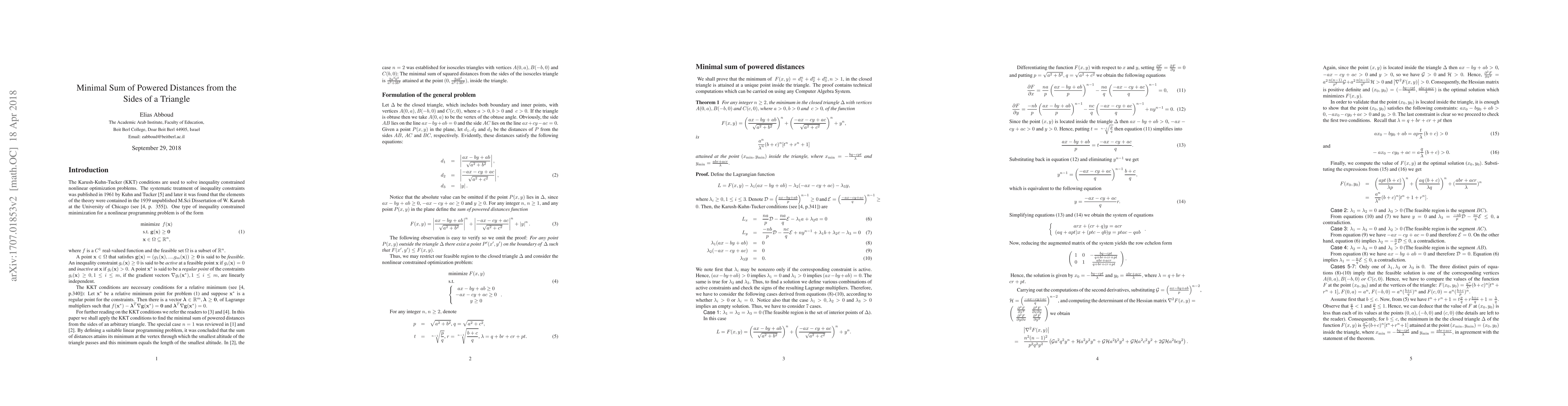 This paper uses KKT conditions to determine the minimal sum of powered distances from the sides of any triangle, presenting a novel application of optimization theory in geometric problems.