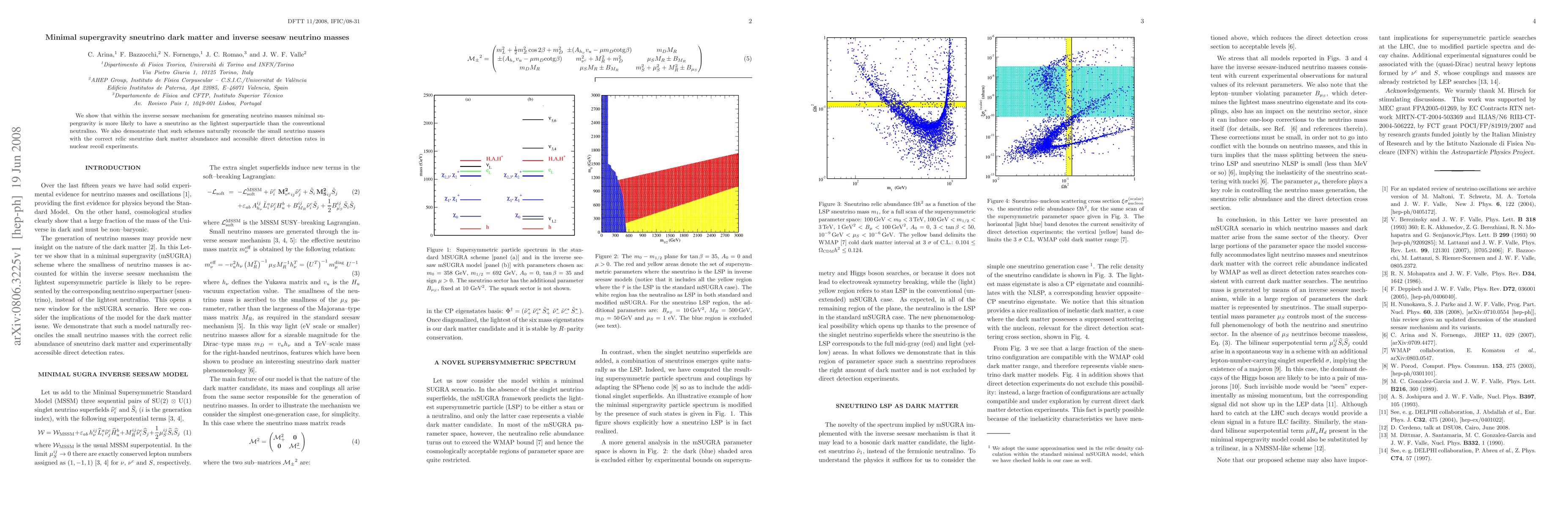 This paper demonstrates that minimal supergravity models favor sneutrino dark matter over neutralino in the inverse seesaw mechanism for neutrino masses, while also achieving the correct relic abundance and direct detection rates.