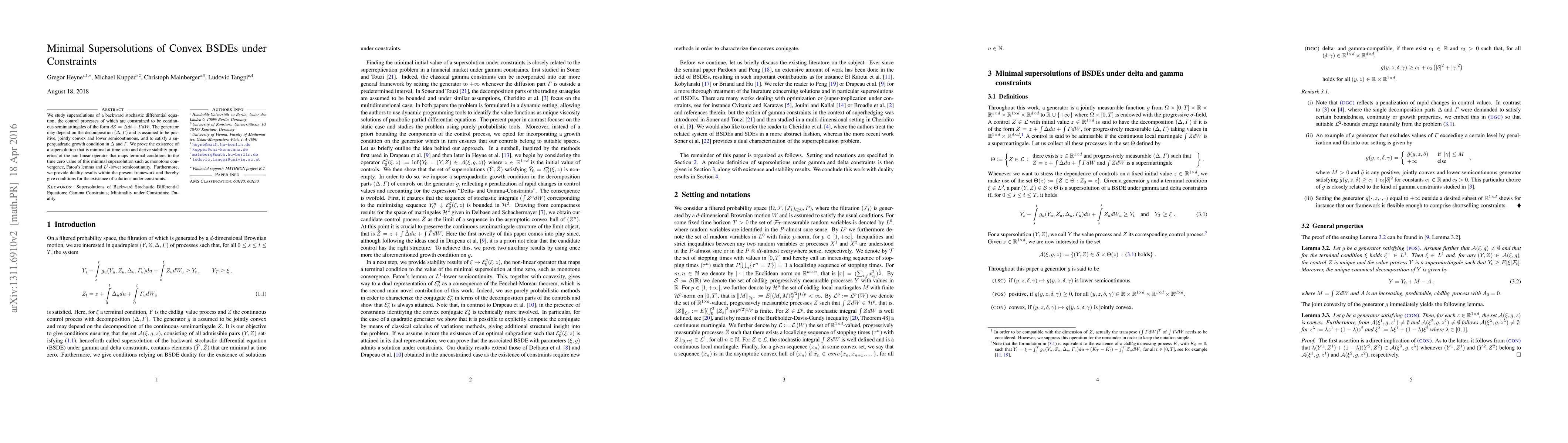 We study supersolutions of a backward stochastic differential equation, the control processes of which are constrained to be continuous semimartingales of the form $dZ = {\Delta}dt + {\Gamma}dW$. The generator may depend on the decomposition $({\Delta},{\Gamma})$ and is assumed to be positive, jointly convex and lower semicontinuous, and to satisfy a superquadratic growth condition in ${\Delta}$ and ${\Gamma}$. We prove the existence of a supersolution that is minimal at time zero and derive stability properties of the non-linear operator that maps terminal conditions to the time zero value of this minimal supersolution such as monotone convergence, Fatou's lemma and $L^1$-lower semicontinuity. Furthermore, we provide duality results within the present framework and thereby give conditions for the existence of solutions under constraints.
