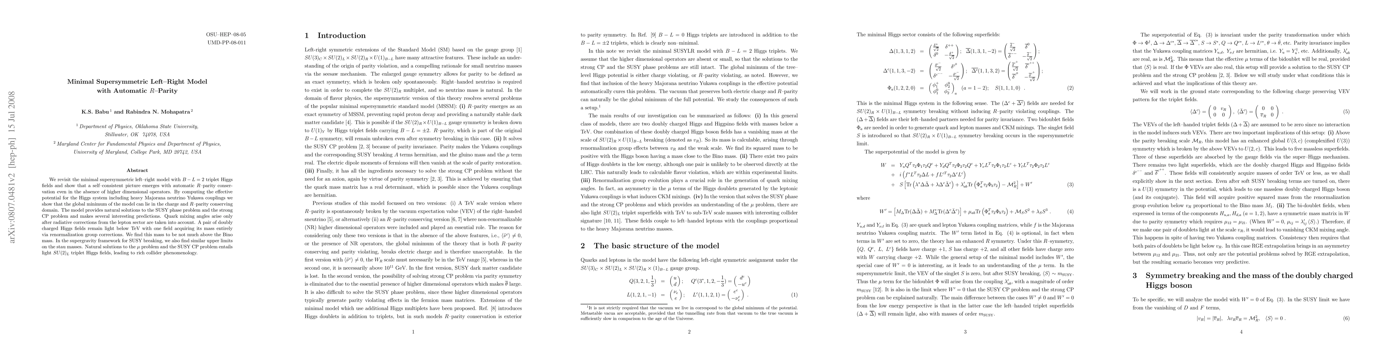 This paper explores the minimal supersymmetric left-right model with automatic R-parity conservation, demonstrating that it naturally resolves the SUSY phase problem and the strong CP problem. It predicts light doubly charged Higgs fields and offers rich collider phenomenology, including implications for stau and quark mixing masses.