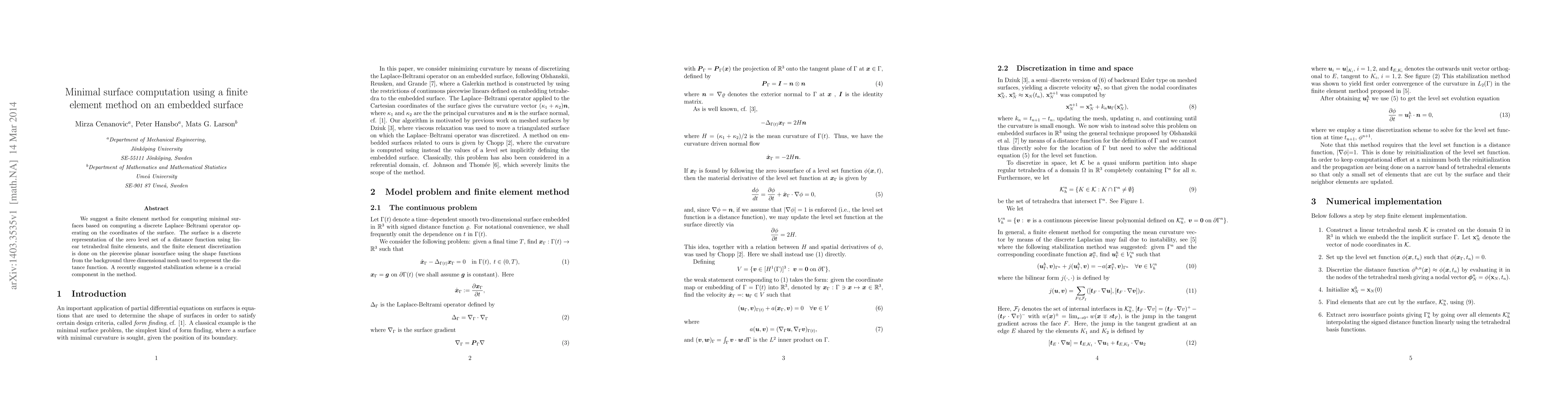 This paper proposes a finite element method for computing minimal surfaces by discretizing the Laplace-Beltrami operator on embedded surfaces using linear tetrahedral elements. The method employs a stabilization scheme to ensure accurate results.