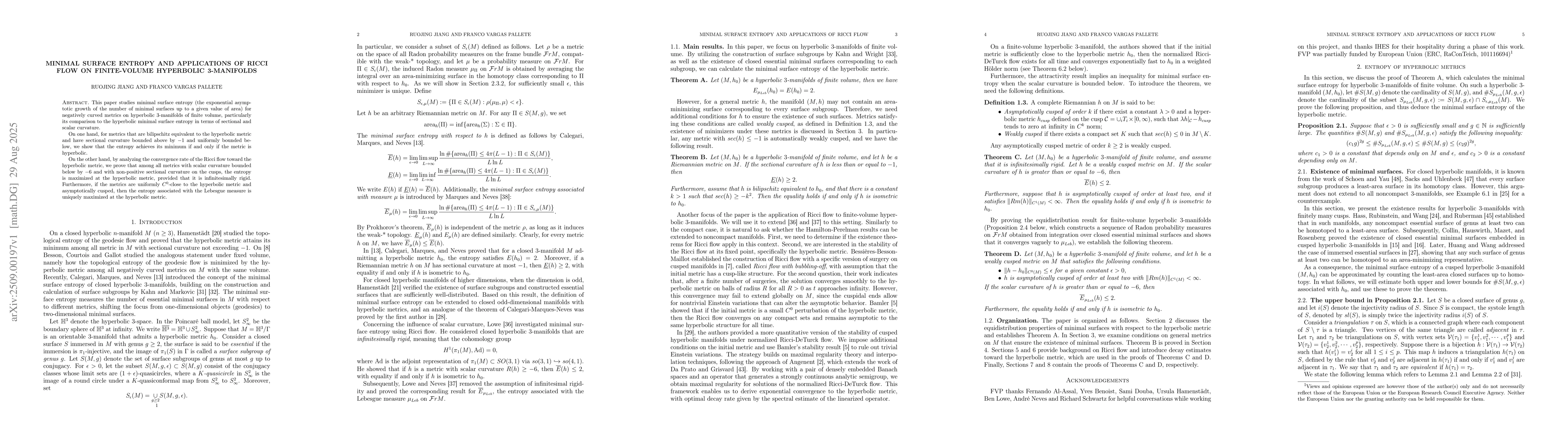 This paper studies minimal surface entropy (the exponential asymptotic growth of the number of minimal surfaces up to a given value of area) for negatively curved metrics on hyperbolic $3$-manifolds of finite volume, particularly its comparison to the hyperbolic minimal surface entropy in terms of sectional and scalar curvature. On one hand, for metrics that are bilipschitz equivalent to the hyperbolic metric and have sectional curvature bounded above by $-1$ and uniformly bounded below, we show that the entropy achieves its minimum if and only if the metric is hyperbolic. On the other hand, by analyzing the convergence rate of the Ricci flow toward the hyperbolic metric, we prove that among all metrics with scalar curvature bounded below by $-6$ and with non-positive sectional curvature on the cusps, the entropy is maximized at the hyperbolic metric, provided that it is infinitesimally rigid. Furthermore, if the metrics are uniformly $C^0$-close to the hyperbolic metric and asymptotically cusped, then the entropy associated with the Lebesgue measure is uniquely maximized at the hyperbolic metric.