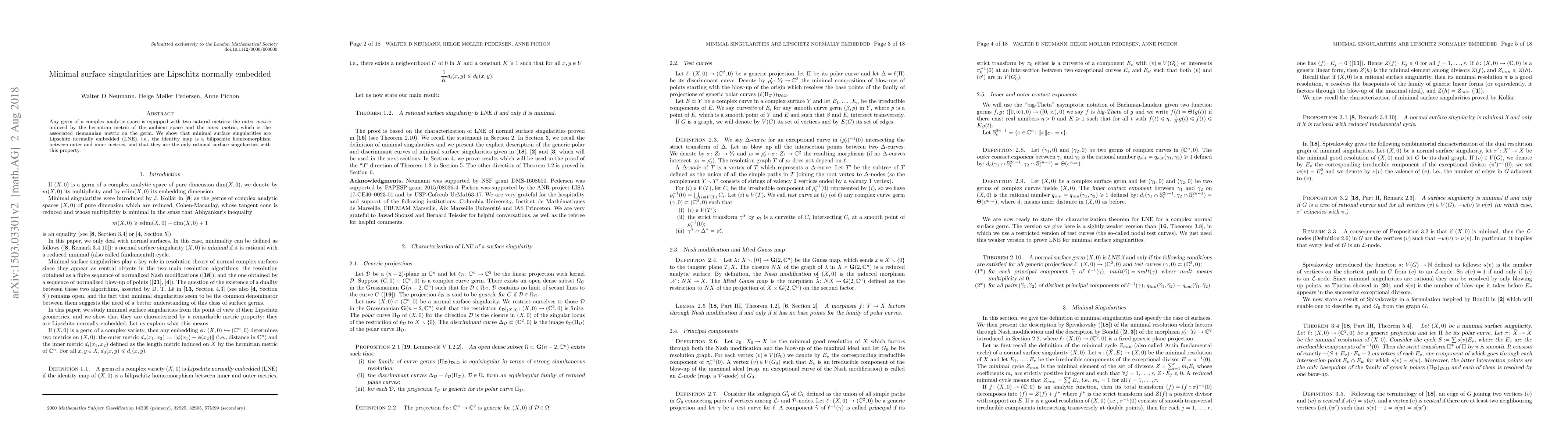 This paper demonstrates that minimal surface singularities are Lipschitz normally embedded (LNE), meaning the identity map is a bilipschitz homeomorphism between the outer and inner metrics, and identifies them as the unique rational surface singularities with this property.