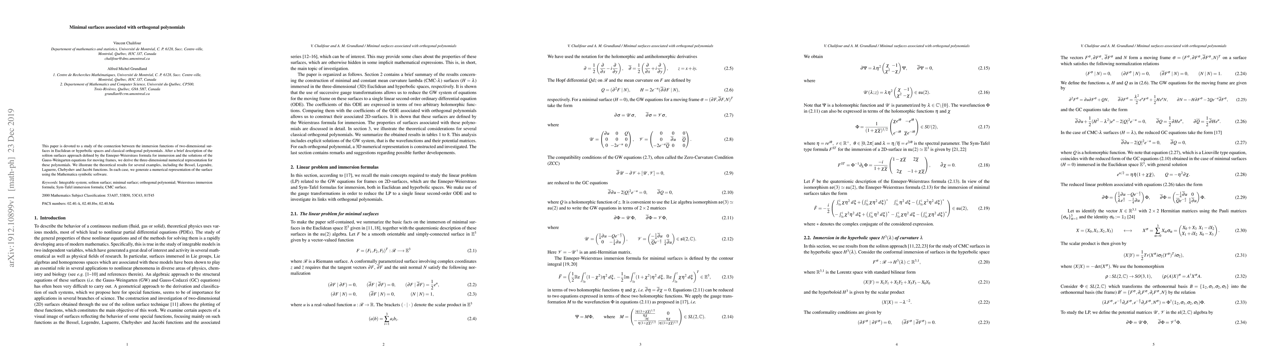 This paper is devoted to a study of the connection between the immersion functions of two-dimensional surfaces in Euclidean or hyperbolic spaces and classical orthogonal polynomials. After a brief description of the soliton surfaces approach defined by the Enneper-Weierstrass formula for immersion and the solutions of the Gauss-Weingarten equations for moving frames, we derive the three-dimensional numerical representation for these polynomials. We illustrate the theoretical results for several examples, including the Bessel, Legendre, Laguerre, Chebyshev and Jacobi functions. In each case, we generate a numerical representation of the surface using the Mathematica symbolic software.