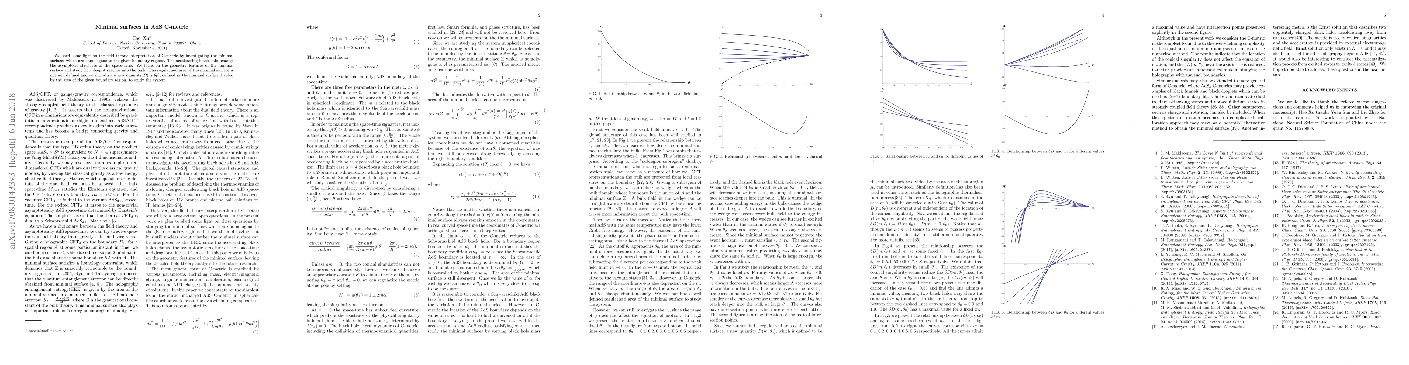 We shed some light on the field theory interpretation of C-metric by investigating the minimal surfaces which are homologous to the given boundary regions. The accelerating black holes change the asymptotic structure of the space-time. We focus on the geometry features of the minimal surface and study how deep it reaches into the bulk. The regularized area of the minimal surface is not well defined and we introduce a new quantity $D(m,\theta_0)$, defined as the minimal surface divided by the area of the given boundary region, to study the system.