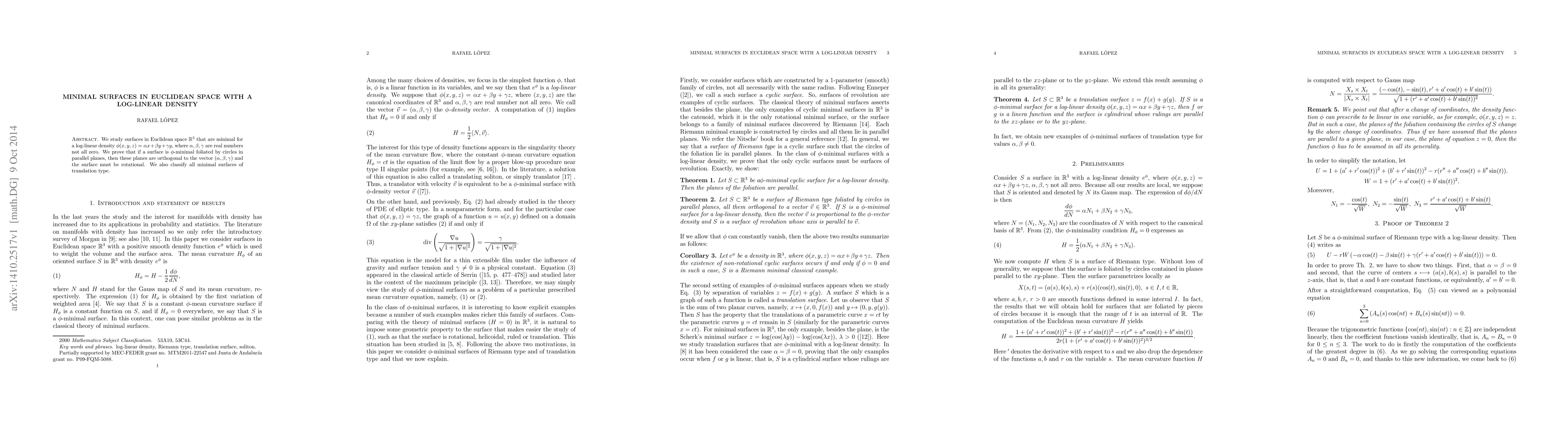 We study surfaces in Euclidean space ${\mathbb R}^3$ that are minimal for a log-linear density $\phi(x,y,z)=\alpha x+\beta y+\gamma y$, where $\alpha,\beta,\gamma$ are real numbers not all zero. We prove that if a surface is $\phi$-minimal foliated by circles in parallel planes, then these planes are orthogonal to the vector $(\alpha,\beta,\gamma)$ and the surface must be rotational. We also classify all minimal surfaces of translation type.