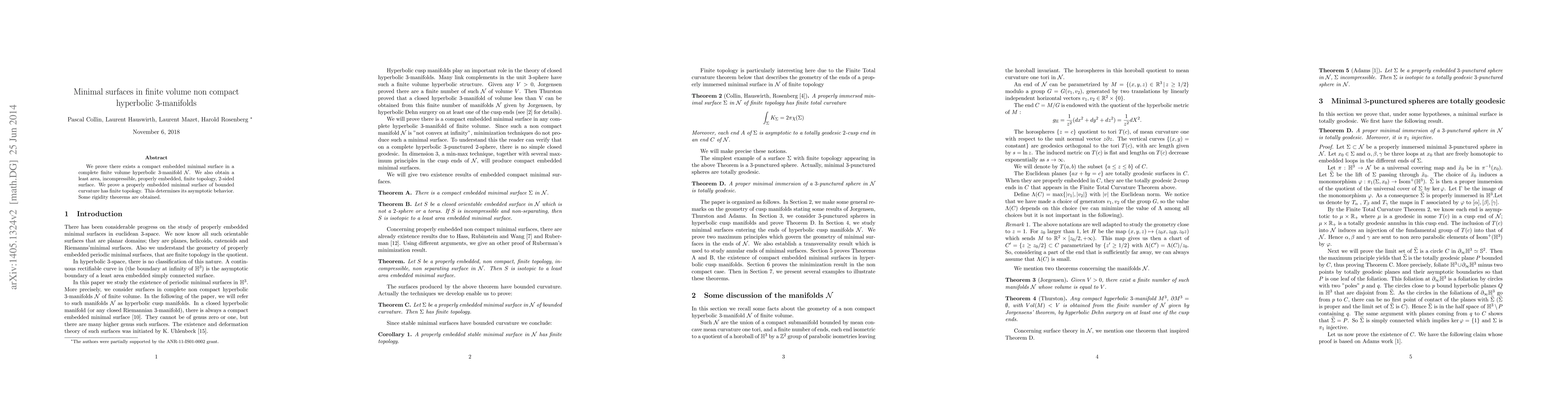 We prove there exists a compact embedded minimal surface in a complete finite volume hyperbolic $3$-manifold $\mathcal{N}$. We also obtain a least area, incompressible, properly embedded, finite topology, $2$-sided surface. We prove a properly embedded minimal surface of bounded curvature has finite topology. This determines its asymptotic behavior. Some rigidity theorems are obtained.