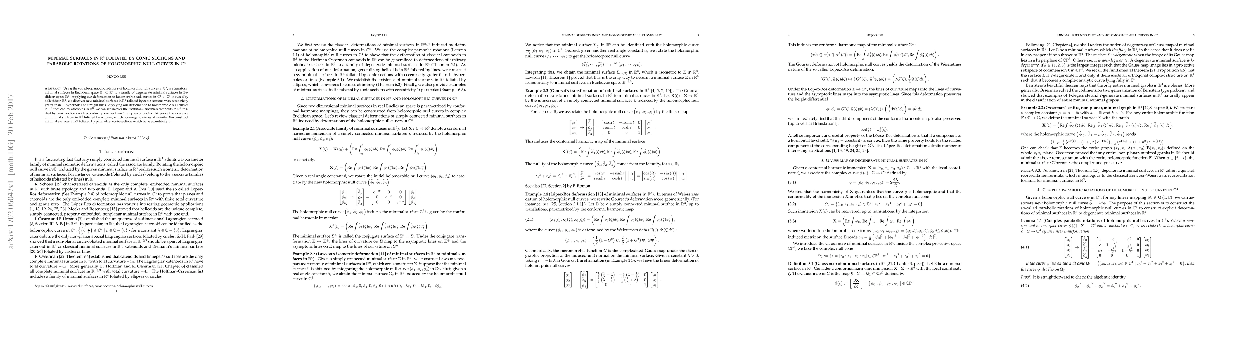 This paper explores the transformation of minimal surfaces in ${\mathbb{R}}^{3}$ via complex parabolic rotations into degenerate minimal surfaces in ${\mathbb{R}}^{4}$, discovering new foliated minimal surfaces by hyperbolas, parabolas, and ellipses. It rediscovers the Hoffman-Osserman catenoids and proves the existence of minimal surfaces foliated by converging ellipses and parabolas in ${\mathbb{R}}^{4}$.