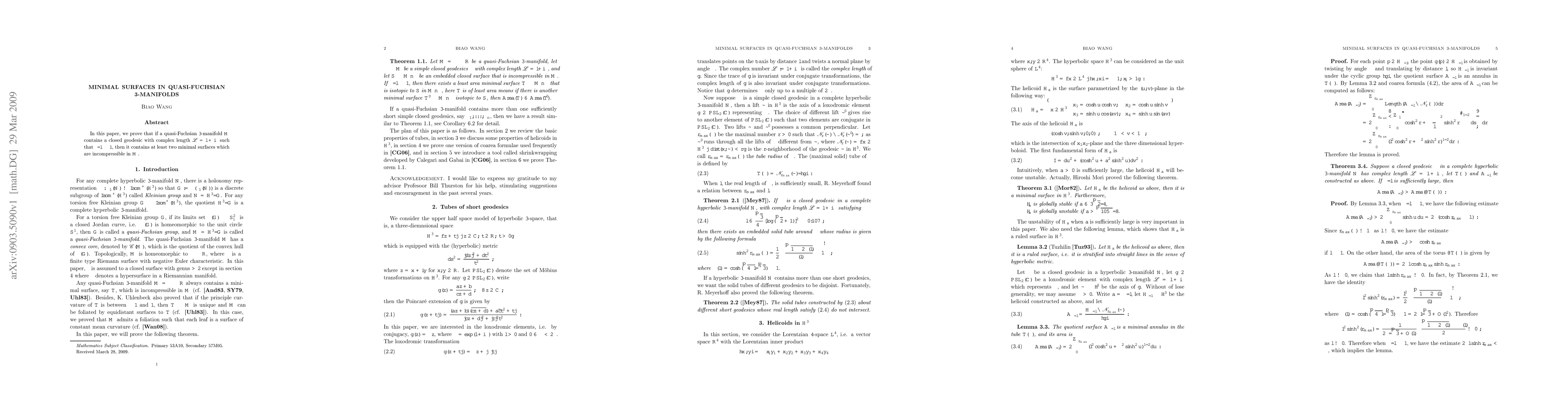 A quasi-Fuchsian 3-manifold containing a specific complex-length simple closed geodesic has at least two incompressible minimal surfaces. This finding has implications for the geometry of these manifolds.