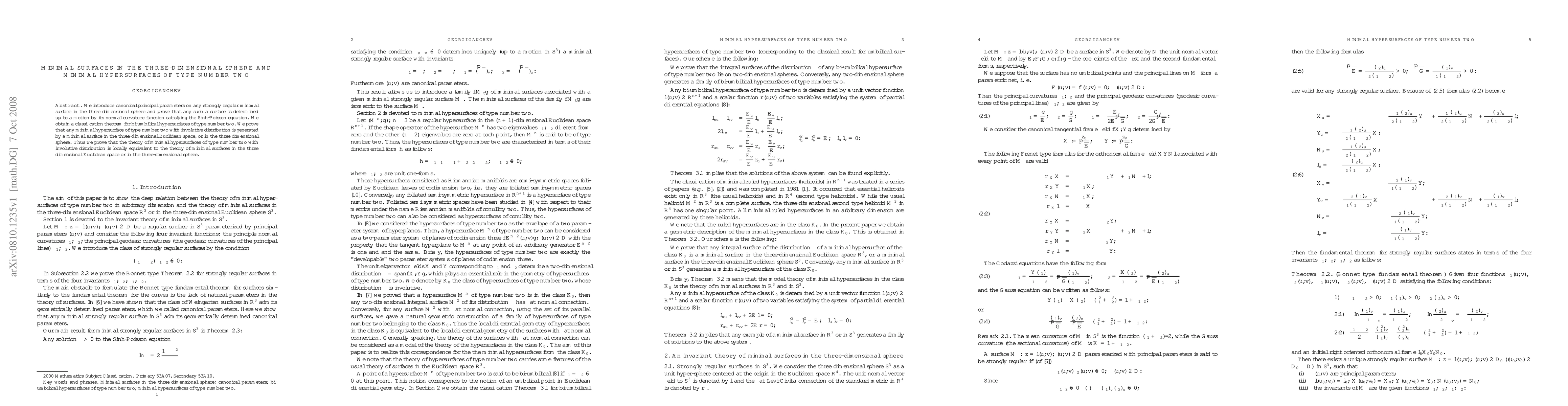 We introduce canonical principal parameters on any strongly regular minimal surface in the three dimensional sphere and prove that any such a surface is determined up to a motion by its normal curvature function satisfying the Sinh-Poisson equation. We obtain a classification theorem for bi-umbilical hypersurfaces of type number two. We prove that any minimal hypersurface of type number two with involutive distribution is generated by a minimal surface in the three-dimensional Euclidean space, or in the three dimensional sphere. Thus we prove that the theory of minimal hypersurfaces of type number two with involutive distribution is locally equivalent to the theory of minimal surfaces in the three dimensional Euclidean space or in the three-dimensional sphere.