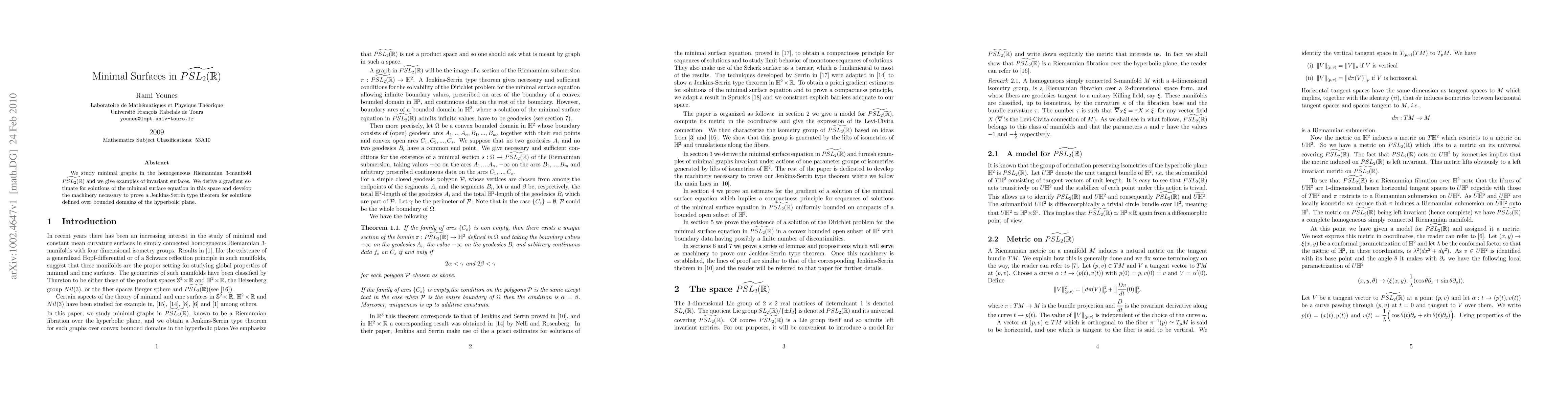 This paper investigates minimal surfaces in the 3-manifold $\widetilde{PSL_2(\mathbb{R})}$ and provides examples of invariant minimal surfaces. It also establishes a gradient estimate for minimal surface solutions and develops the theoretical framework to prove a Jenkins-Serrin type theorem for bounded hyperbolic domains.