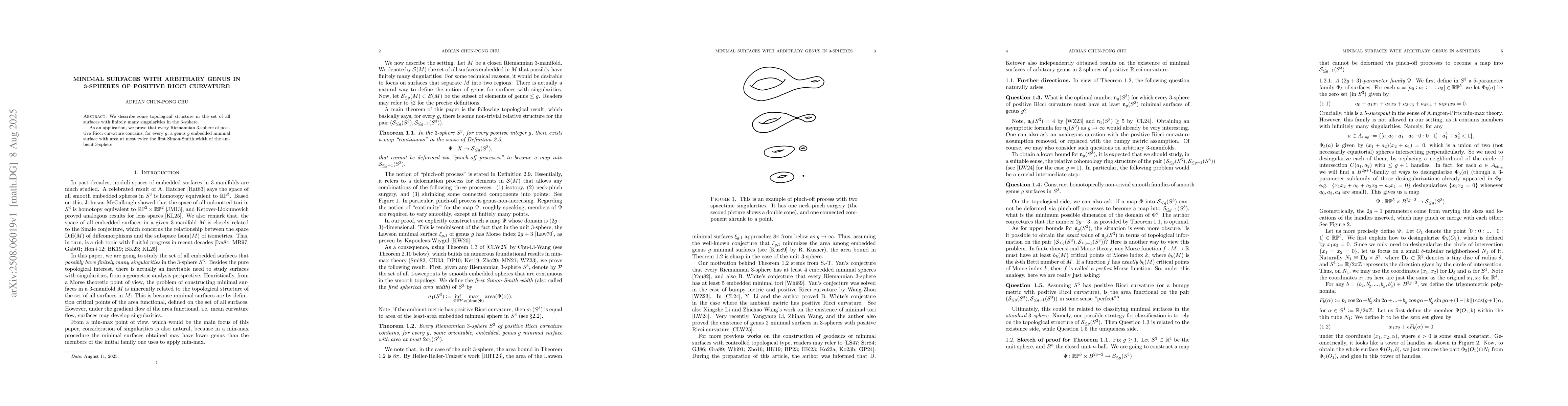 We describe some topological structure in the set of all surfaces with finitely many singularities in the 3-sphere. As an application, we prove that every Riemannian 3-sphere of positive Ricci curvature contains, for every g, a genus g embedded minimal surface with area at most twice the first Simon-Smith width of the ambient 3-sphere.