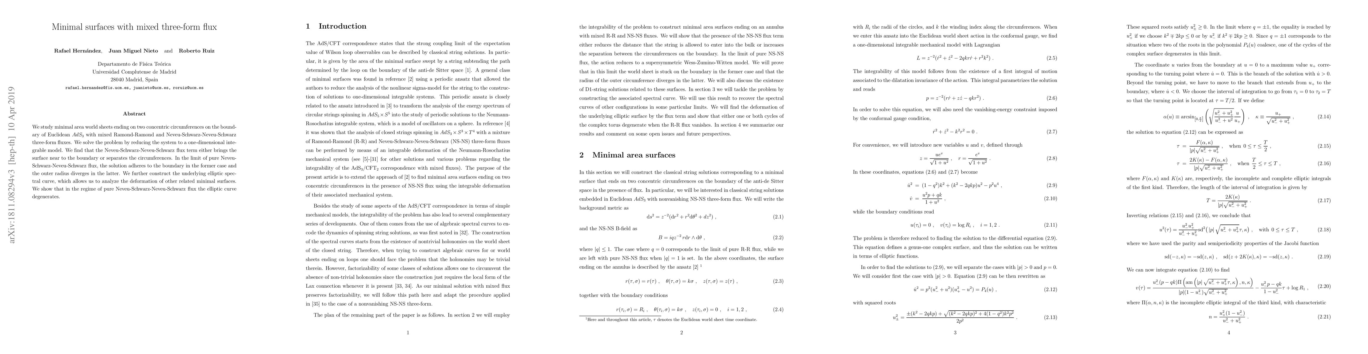 We study minimal area world sheets ending on two concentric circumferences on the boundary of Euclidean $AdS_{3}$ with mixed R-R and NS-NS three-form fluxes. We solve the problem by reducing the system to a one-dimensional integrable model. We find that the NS-NS flux term either brings the surface near to the boundary or separates the circumferences. In the limit of pure NS-NS flux the solution adheres to the boundary in the former case and the outer radius diverges in the latter. We further construct the underlying elliptic spectral curve, which allows us to analyze the deformation of other related minimal surfaces. We show that in the regime of pure NS-NS flux the elliptic curve degenerates.
