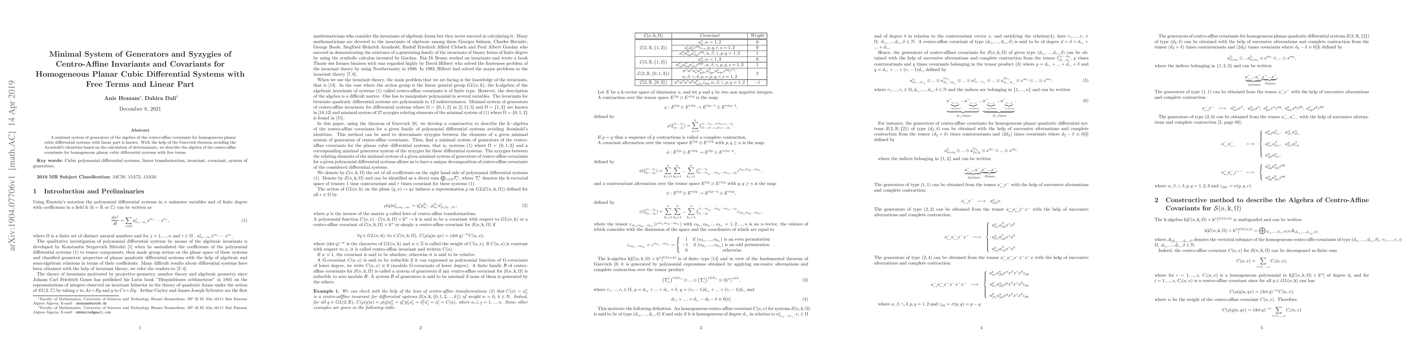 A minimal system of generators of the algebra of the centro-affine covariants for homogeneous planar cubic differential systems with linear part is known. With the help of the Gurevich theorem avoiding the Aronhold's identities based on the calculation of determinants, we describe the algebra of the centro-affne covariants for homogeneous planar cubic differential systems with free terms.