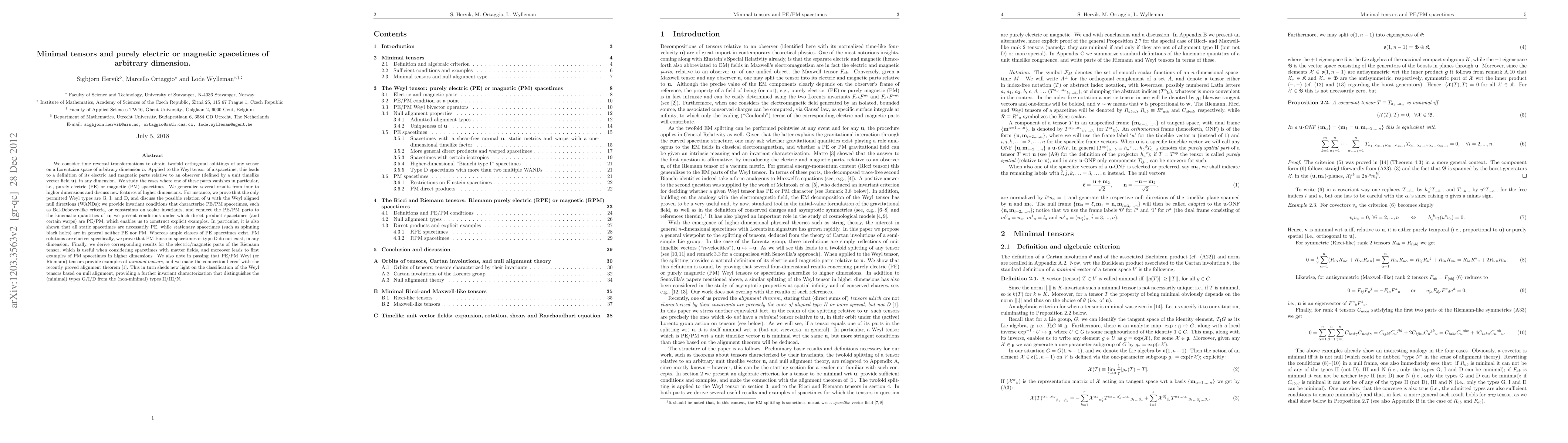 We consider time reversal transformations to obtain twofold orthogonal splittings of any tensor on a Lorentzian space of arbitrary dimension n. Applied to the Weyl tensor of a spacetime, this leads to a definition of its electric and magnetic parts relative to an observer (i.e., a unit timelike vector field u), in any n. We study the cases where one of these parts vanishes in particular, i.e., purely electric (PE) or magnetic (PM) spacetimes. We generalize several results from four to higher dimensions and discuss new features of higher dimensions. We prove that the only permitted Weyl types are G, I_i and D, and discuss the possible relation of u with the WANDs; we provide invariant conditions that characterize PE/PM spacetimes, such as Bel-Debever criteria, or constraints on scalar invariants, and connect the PE/PM parts to the kinematic quantities of u; we present conditions under which direct product spacetimes (and certain warps) are PE/PM, which enables us to construct explicit examples. In particular, it is also shown that all static spacetimes are necessarily PE, while stationary spacetimes (e.g., spinning black holes) are in general neither PE nor PM. Ample classes of PE spacetimes exist, but PM solutions are elusive, and we prove that PM Einstein spacetimes of type D do not exist, for any n. Finally, we derive corresponding results for the electric/magnetic parts of the Riemann tensor. This also leads to first examples of PM spacetimes in higher dimensions. We also note in passing that PE/PM Weyl tensors provide examples of minimal tensors, and we make the connection hereof with the recently proved alignment theorem. This in turn sheds new light on classification of the Weyl tensors based on null alignment, providing a further invariant characterization that distinguishes the types G/I/D from the types II/III/N.