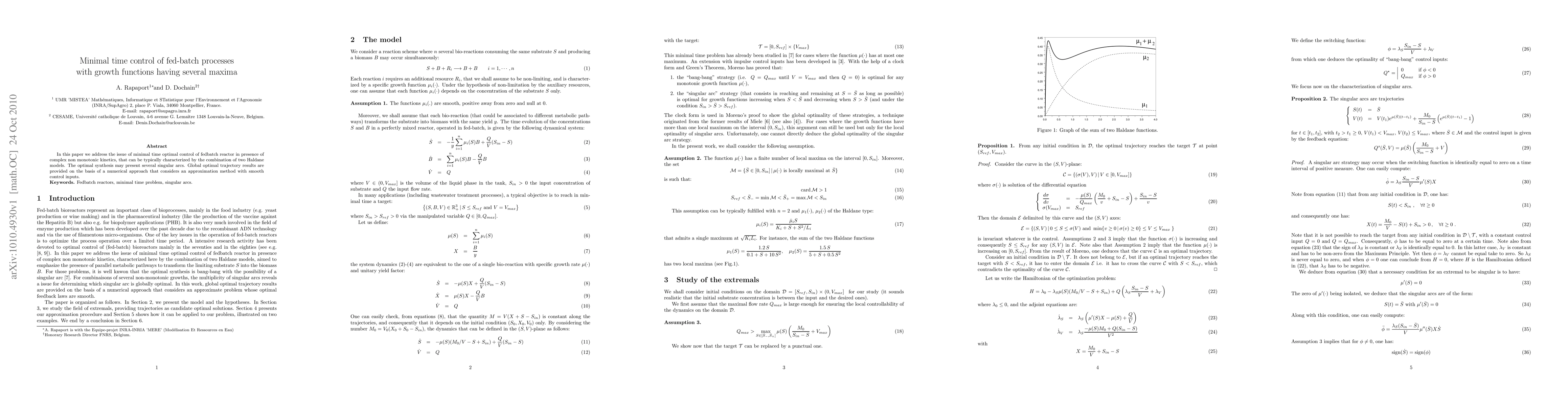 We address the issue of minimal time optimal control of fedbatch reactor in presence of complex non monotonic kinetics, that can be typically characterized by the combination of two Haldane models. The optimal synthesis may present several singular arcs. Global optimal trajectory results are provided on the basis of a numerical approach that considers an approximation method with smooth control inputs.