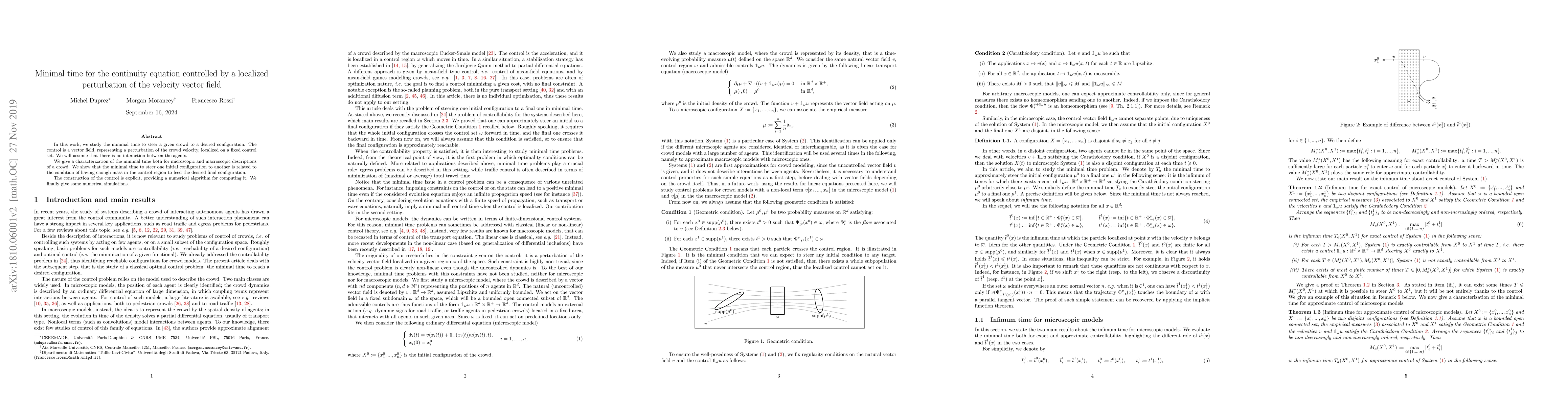 In this work, we study the minimal time to steer a given crowd to a desired configuration. The control is a vector field, representing a perturbation of the crowd velocity, localized on a fixed control set. We will assume that there is no interaction between the agents. We give a characterization of the minimal time both for microscopic and macroscopic descriptions of a crowd. We show that the minimal time to steer one initial configuration to another is related to the condition of having enough mass in the control region to feed the desired final configuration. The construction of the control is explicit, providing a numerical algorithm for computing it. We finally give some numerical simulations.