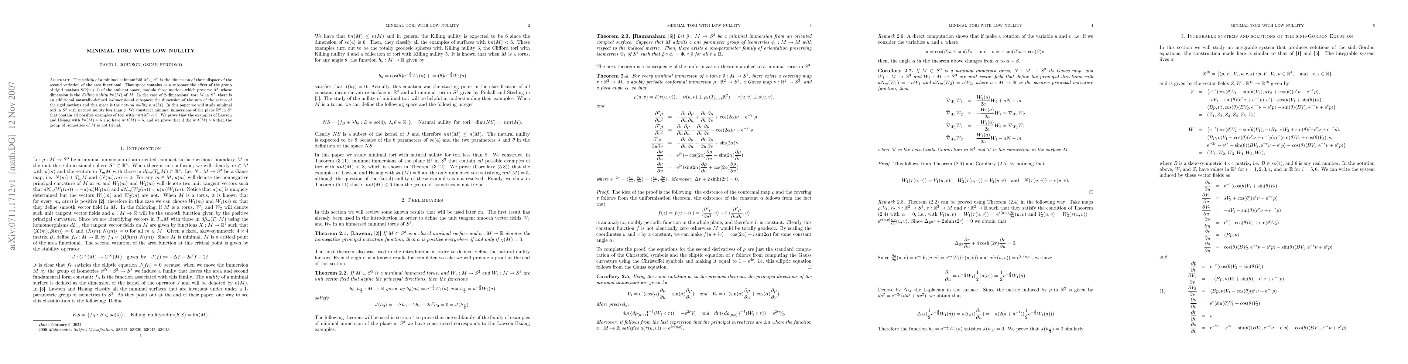 The nullity of a minimal submanifold $M\subset S^{n}$ is the dimension of the nullspace of the second variation of the area functional. That space contains as a subspace the effect of the group of rigid motions $SO(n+1)$ of the ambient space, modulo those motions which preserve $M$, whose dimension is the Killing nullity $kn(M)$ of $M$. In the case of 2-dimensional tori $M$ in $S^{3}$, there is an additional naturally-defined 2-dimensional subspace; the dimension of the sum of the action of the rigid motions and this space is the natural nullity $nnt(M)$. In this paper we will study minimal tori in $S^{3}$ with natural nullity less than 8. We construct minimal immersions of the plane $R^{2}$ in $S^{3}$ that contain all possible examples of tori with $nnt(M)<8$. We prove that the examples of Lawson and Hsiang with $kn(M)=5$ also have $nnt(M)=5$, and we prove that if the $nnt(M)\le6$ then the group of isometries of $M$ is not trivial.