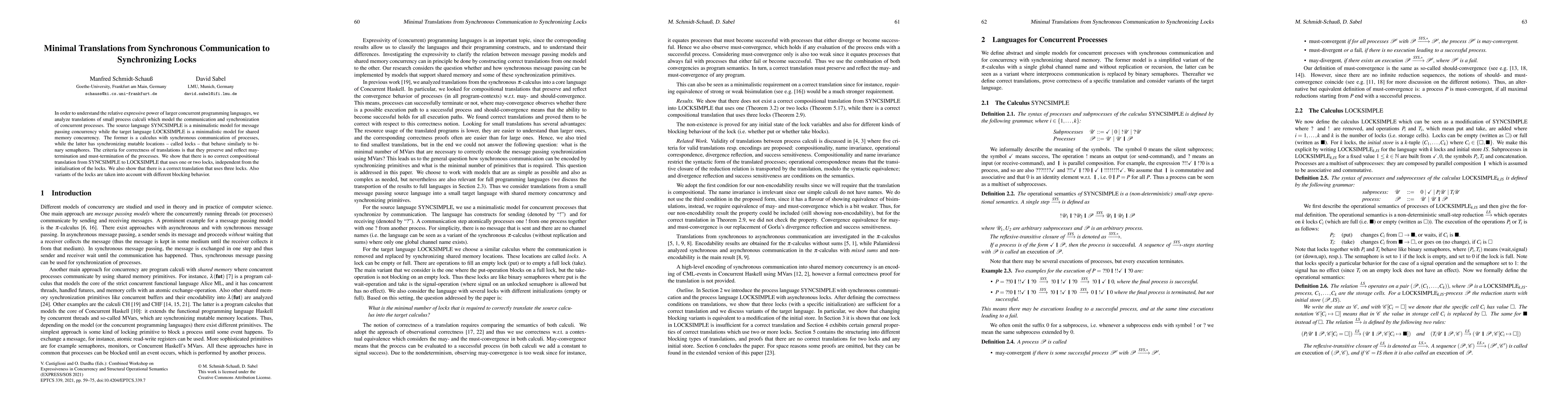 Researchers found that translating a language with synchronous communication to one with shared memory concurrency using minimal locks is challenging, but possible with three locks, while one or two locks cannot preserve process termination properties.