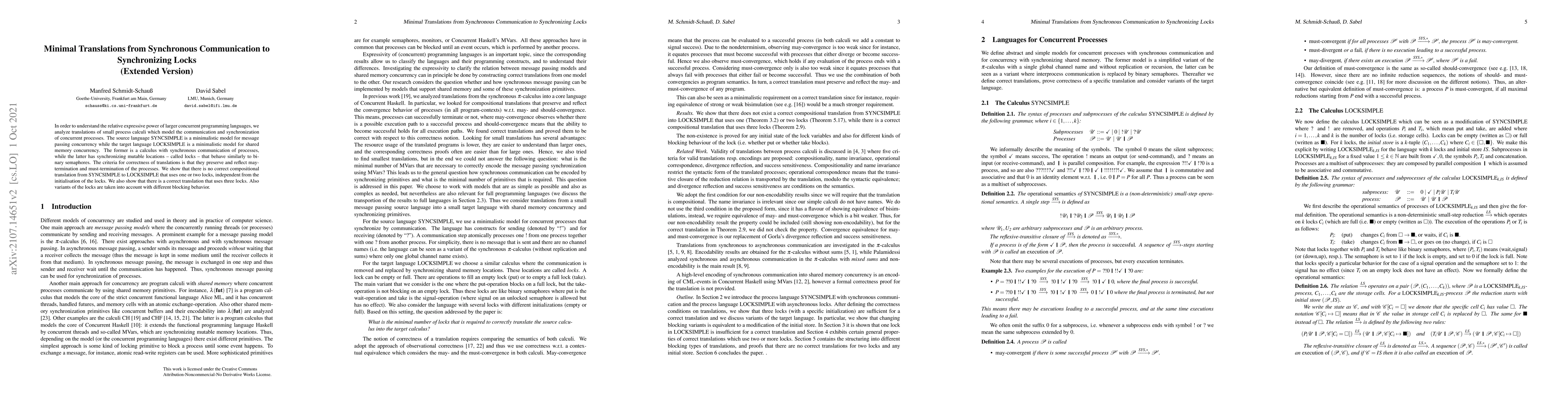 Researchers found that translating synchronous communication from SYNCSIMPLE to synchronizing locks in LOCKSIMPLE requires more than 2 locks for complete correctness, but a translation with 3 locks is possible.