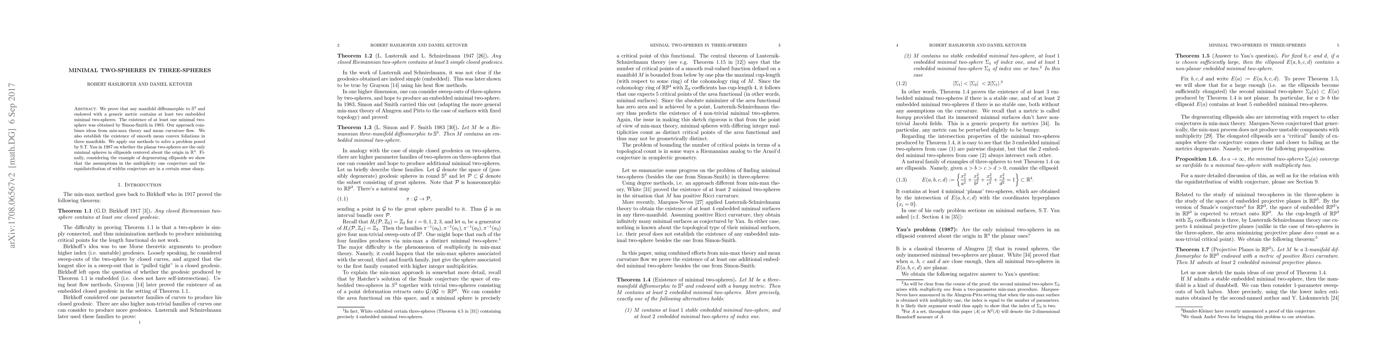 This paper proves that any three-sphere with a generic metric contains at least two embedded minimal two-spheres, extending a result from 1983. The authors utilize min-max theory and mean curvature flow to establish this and also solve a 1987 problem by Yau regarding the uniqueness of minimal spheres in ellipsoids.