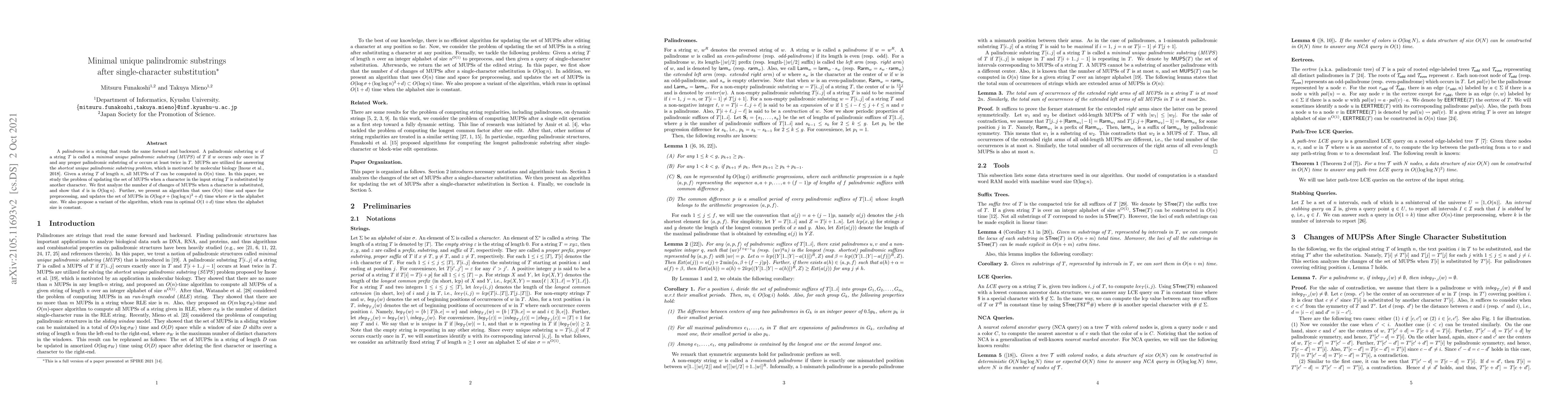 Researchers studied how to update a set of unique palindromic substrings after a single character substitution in a string, finding that the number of changes is in O(log n) time and proposing an algorithm for updating in O(logυ + (ωlog¶n)^2 + d) time.