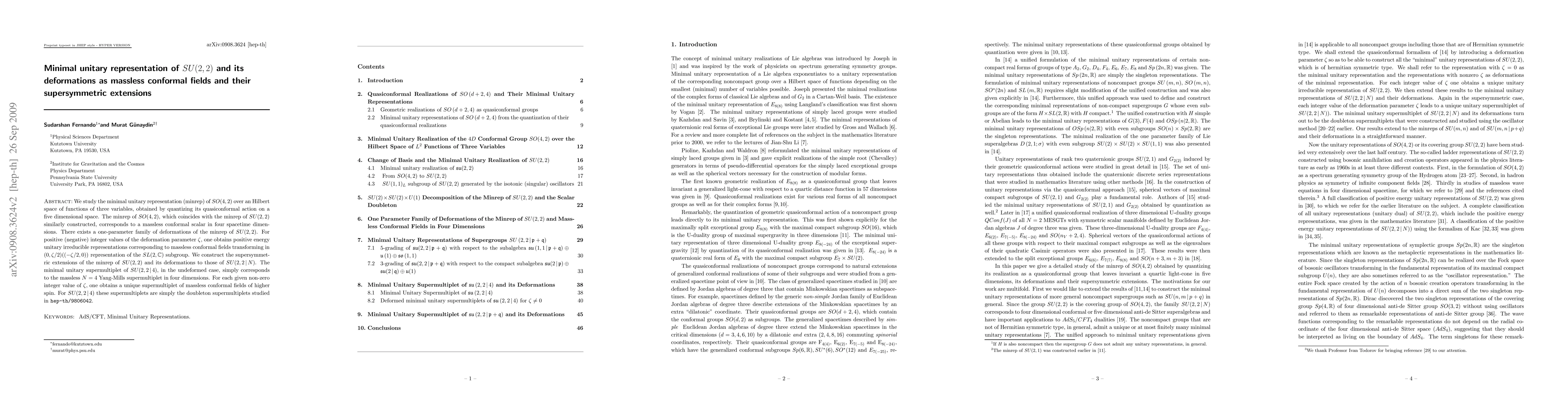 This paper investigates the minimal unitary representation of SU(2,2) and its deformations, linking them to massless conformal fields in four-dimensional spacetime. It also explores the supersymmetric extensions of these representations, showing that for specific deformation parameters, unique higher-spin supermultiplets emerge, including the N=4 Yang-Mills supermultiplet.