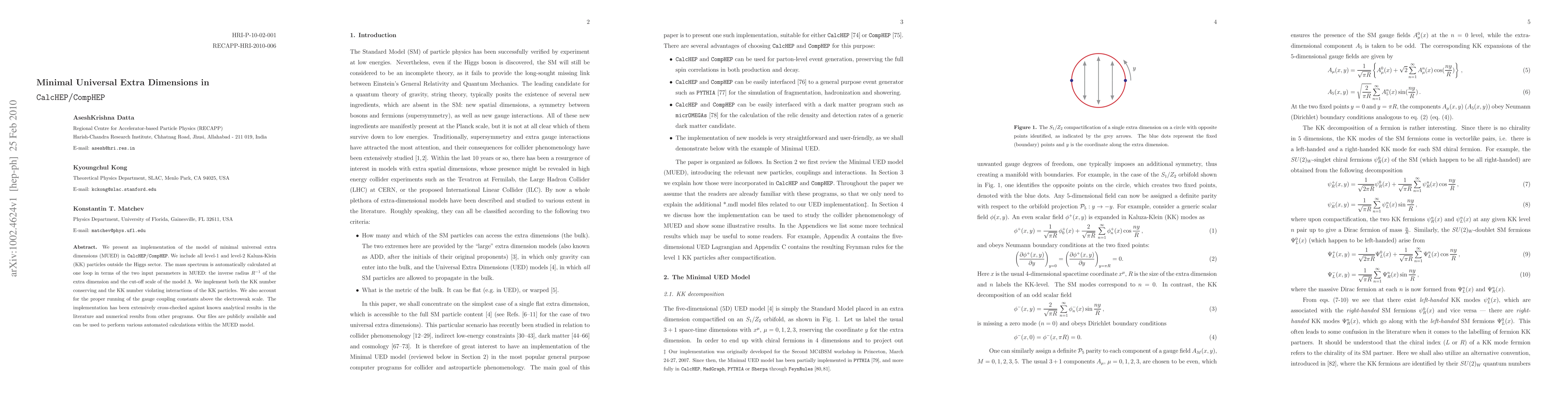 This paper details an implementation of the minimal universal extra dimensions (MUED) model in the CalcHEP/CompHEP software, including all level-1 and level-2 Kaluza-Klein particles. The mass spectrum is calculated at one loop, and both KK number conserving and violating interactions are implemented, with extensive cross-checking against existing results.