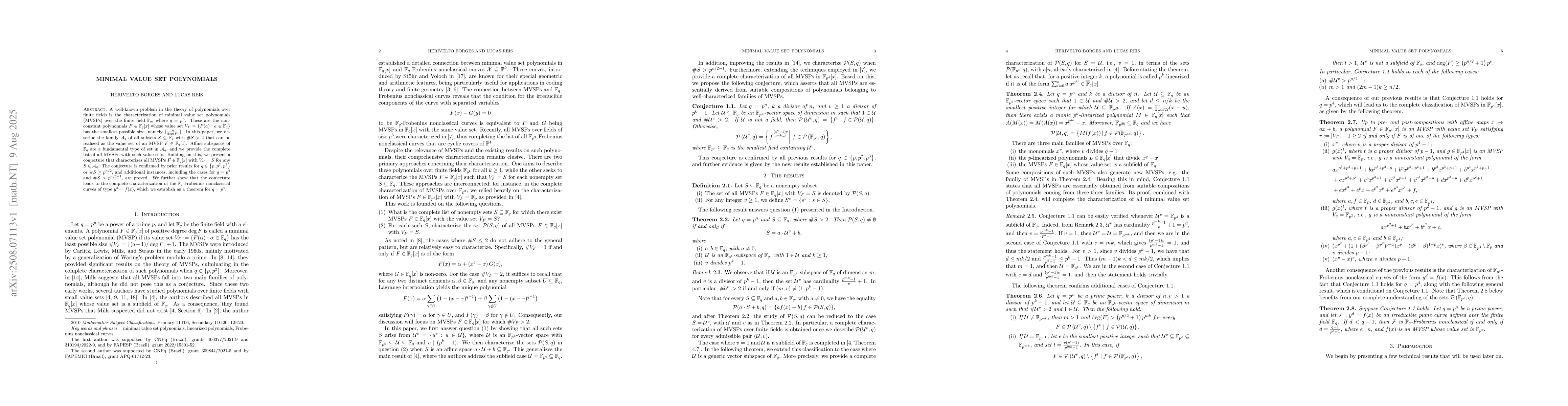 The work presents novel results on the existence of Frobenius nonclassical components in curves with separated variables and the characterization of minimal valueset polynomials over finite fields.