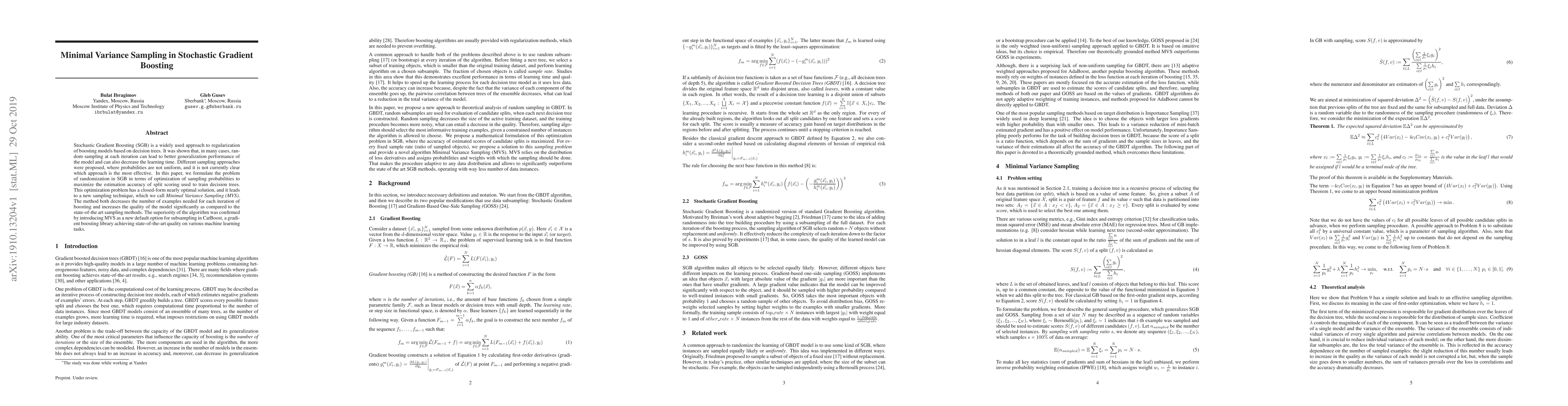 This paper proposes Minimal Variance Sampling (MVS) for Stochastic Gradient Boosting, optimizing sampling probabilities to enhance split scoring accuracy. MVS reduces the number of examples needed per iteration and significantly improves model quality compared to existing methods, as demonstrated in the CatBoost library.
