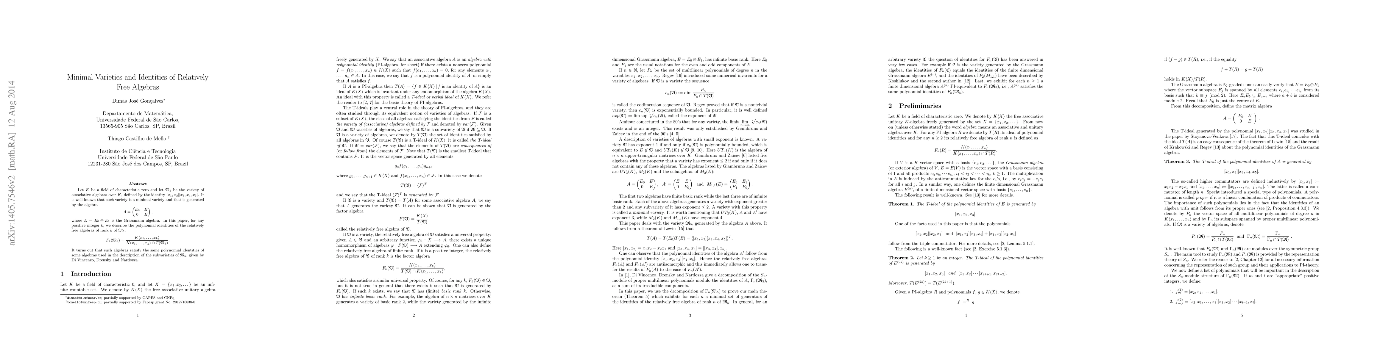 Let $K$ be a field of characteristic zero and let $\mathfrak{M}_5$ be the variety of associative algebras over $K$, defined by the identity $[x_1,x_2][x_3,x_4,x_5]$. It is well-known that such variety is a minimal variety and that is generated by the algebra $$A=\begin{pmatrix} E_0 & E\\ 0 & E\\ \end{pmatrix},$$ where $E=E_0\oplus E_1$ is the Grassmann algebra. In this paper, for any positive integer $k$, we describe the polynomial identities of the relatively free algebras of rank $k$ of $\mathfrak{M}_5$, \[F_k(\mathfrak{M}_5)=\dfrac{K\langle x_1,\dots, x_k \rangle}{K\langle x_1,\dots, x_k \rangle\cap T(\mathfrak{M}_5)}.\] It turns out that such algebras satisfy the same polynomial identities of some algebras used in the description of the subvarieties of $\mathfrak{M}_5$, given by Di Vincenzo, Drensky and Nardozza.