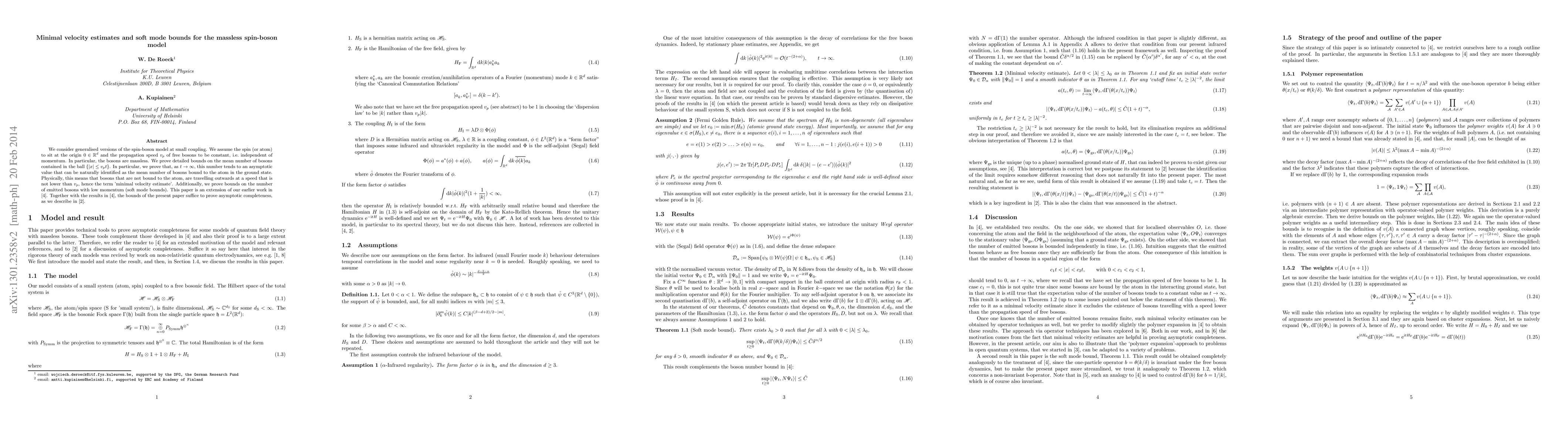 We consider generalised versions of the spin-boson model at small coupling. We assume the spin (or atom) to sit at the origin $0 \in \mathbb{R}^d$ and the propagation speed $v_p$ of free bosons to be constant, i.e.\ independent of momentum. In particular, the bosons are massless. We prove detailed bounds on the mean number of bosons contained in the ball $\{|x| \leq v_p t \}$. In particular, we prove that, as $t \to \infty$, this number tends to an asymptotic value that can be naturally identified as the mean number of bosons bound to the atom in the ground state. Physically, this means that bosons that are not bound to the atom, are travelling outwards at a speed that is not lower than $v_p$, hence the term 'minimal velocity estimate'. Additionally, we prove bounds on the number of emitted bosons with low momentum (soft mode bounds). This paper is an extension of our earlier work in 'Approach to ground state and time-independent photon bound for massless spin-boson models' (arXiv:1109.5582, Ann. H. Poincare, 2012). Together with the results in that paper, the bounds of the present paper suffice to prove asymptotic completeness, as we describe in 'Asymptotic completeness for the massless spin-boson model'(arXiv:1301.2357).