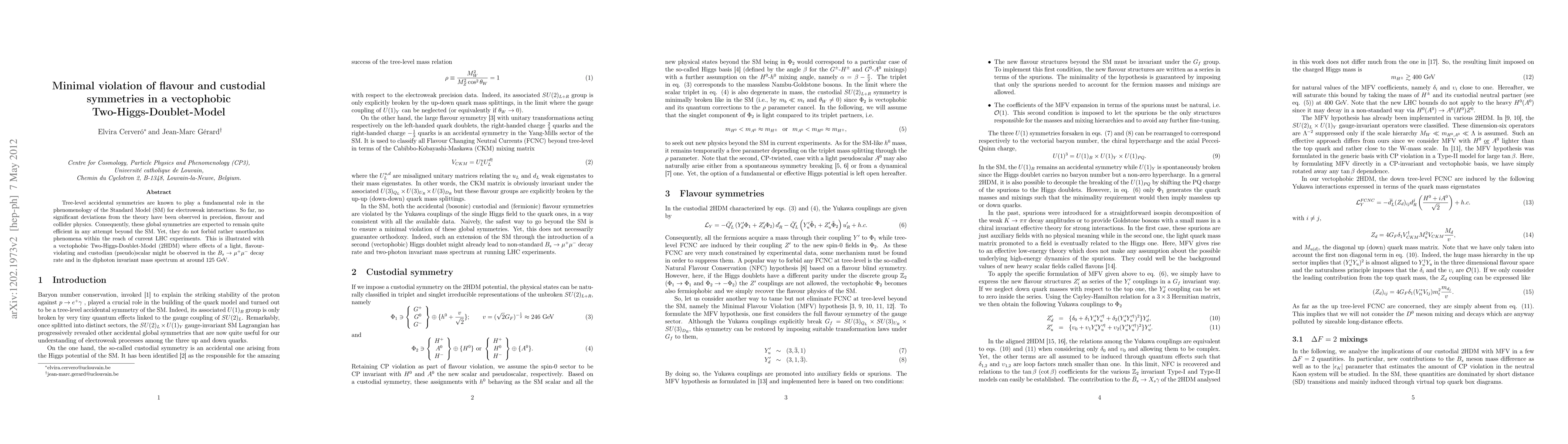 Tree-level accidental symmetries are known to play a fundamental role in the phenomenology of the Standard Model (SM) for electroweak interactions. So far, no significant deviations from the theory have been observed in precision, flavour and collider physics. Consequently, these global symmetries are expected to remain quite efficient in any attempt beyond the SM. Yet, they do not forbid rather unorthodox phenomena within the reach of current LHC experiments. This is illustrated with a vectophobic Two-Higgs-Doublet-Model (2HDM) where effects of a light, flavour-violating and custodian (pseudo)scalar might be observed in the $B_s\to\mu^+\mu^-$ decay rate and in the diphoton invariant mass spectrum at around 125 GeV.