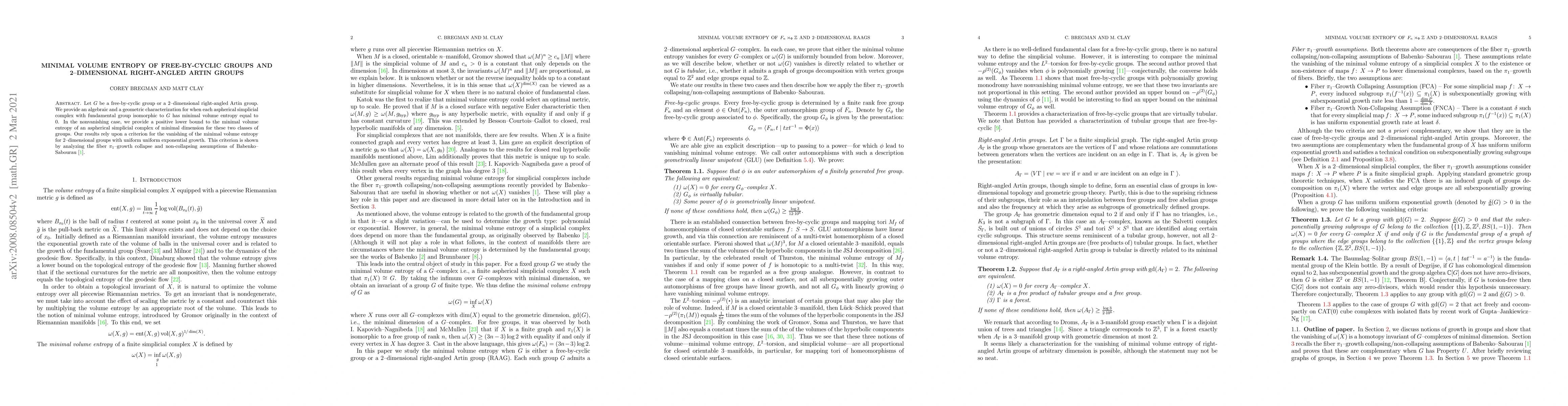 Let $G$ be a free-by-cyclic group or a 2-dimensional right-angled Artin group. We provide an algebraic and a geometric characterization for when each aspherical simplicial complex with fundamental group isomorphic to $G$ has minimal volume entropy equal to 0. In the nonvanishing case, we provide a positive lower bound to the minimal volume entropy of an aspherical simplicial complex of minimal dimension for these two classes of groups. Our results rely upon a criterion for the vanishing of the minimal volume entropy for 2-dimensional groups with uniform uniform exponential growth. This criterion is shown by analyzing the fiber $\pi_1$-growth collapse and non-collapsing assumptions of Babenko-Sabourau.