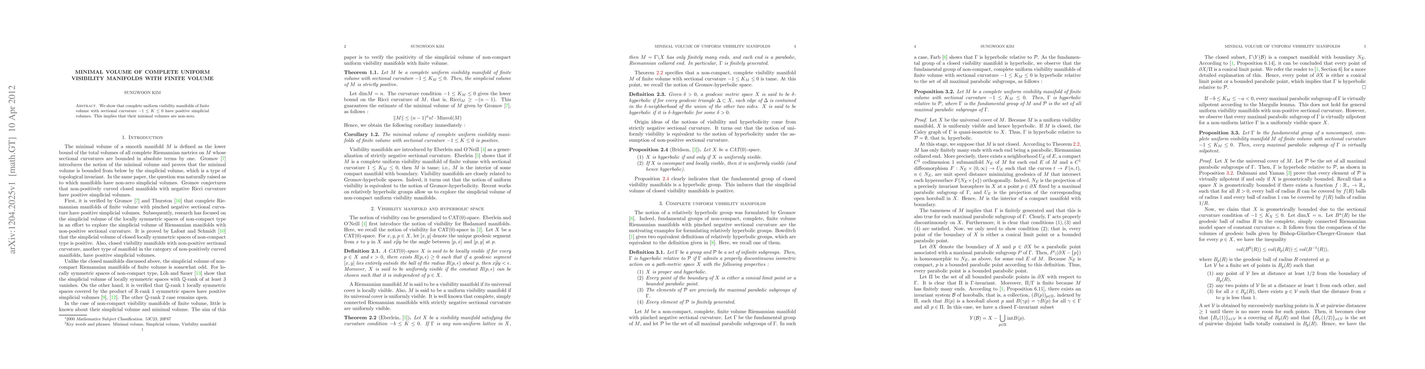 Complete uniform visibility manifolds with finite volume and negative curvature have positive simplicial volumes, implying non-zero minimal volumes.