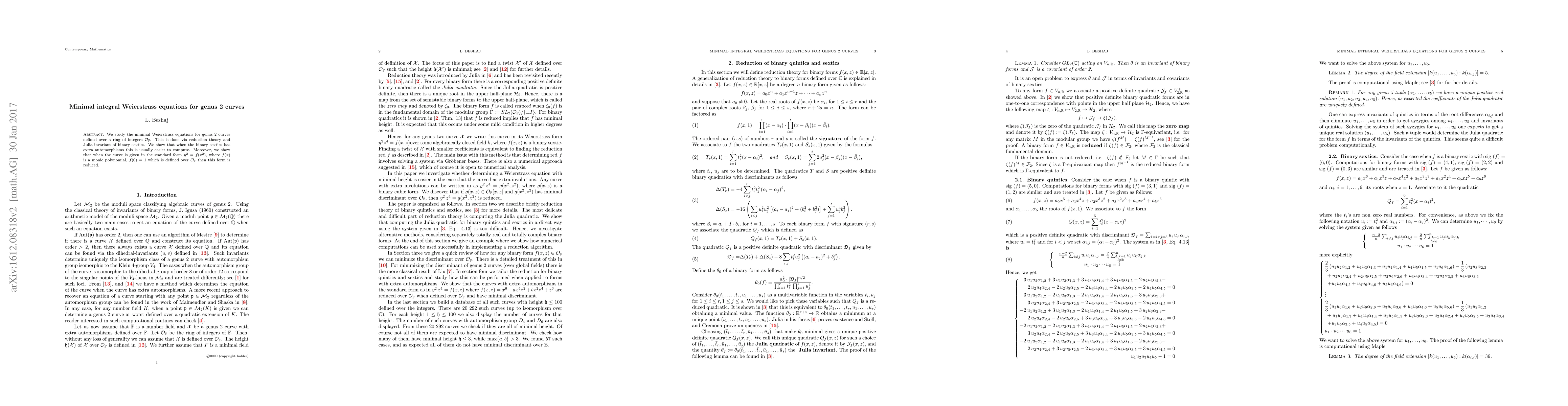 This research focuses on finding minimal Weierstrass equations for genus 2 curves over a ring of integers, using reduction theory and the Julia invariant of binary sextics. It demonstrates that extra automorphisms in binary sextics simplify computation and confirms that a specific curve form, y^2=f(x^2) with conditions on f(x), is reduced when defined over the ring of integers.