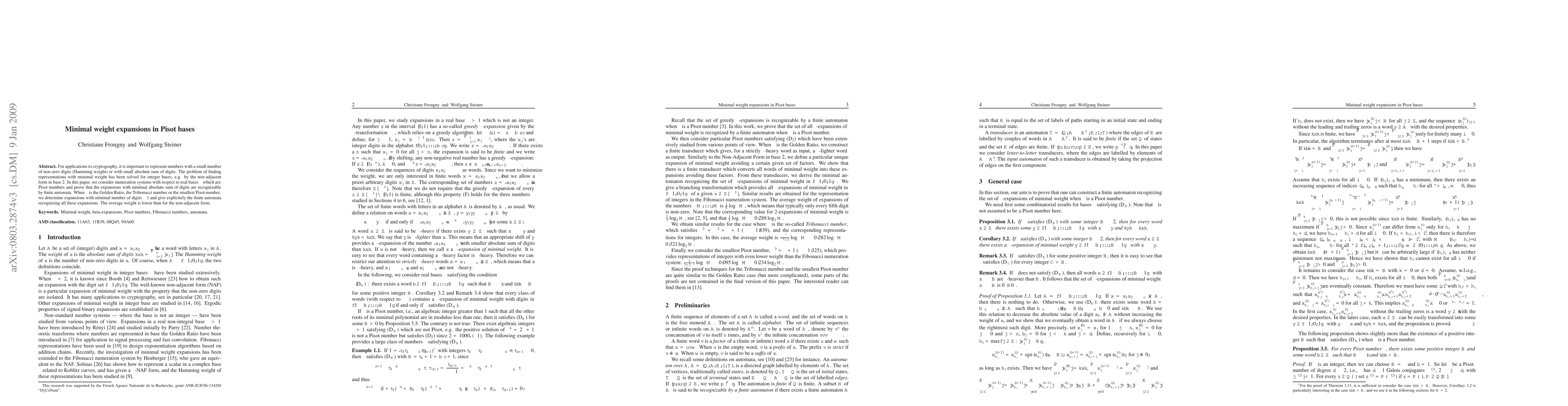 This paper explores minimal weight expansions in numeration systems based on Pisot numbers, proving that expansions with minimal absolute sum of digits are recognizable by finite automata. It specifically determines minimal digit expansions for the Golden Ratio, Tribonacci number, and the smallest Pisot number, showing that their average weight is lower than that of the non-adjacent form in base 2.