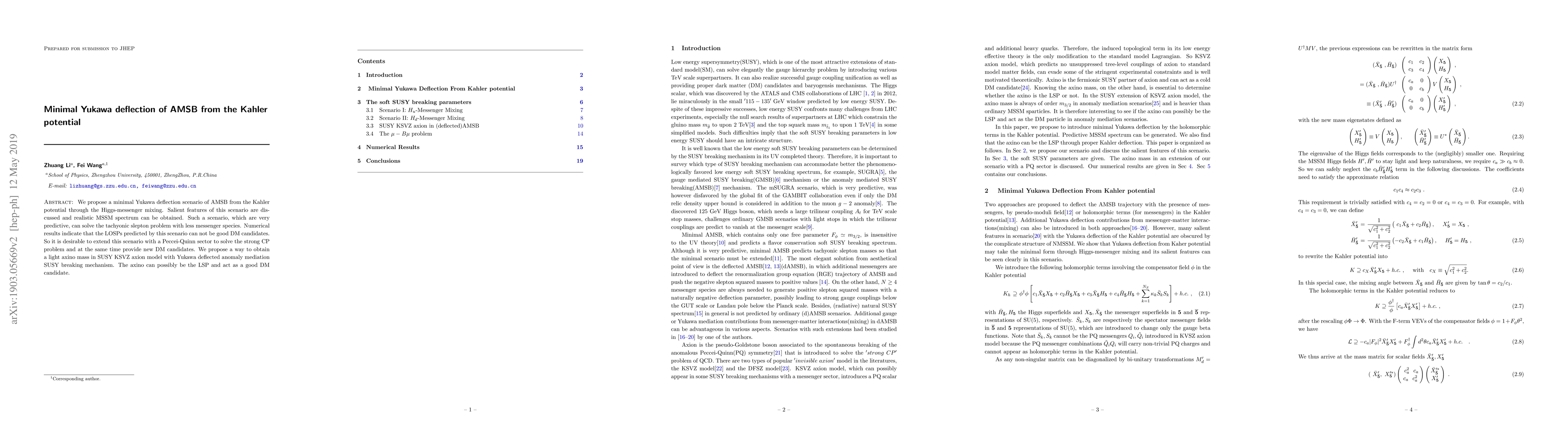 The paper introduces a minimal Yukawa deflection scenario from the Kahler potential in Anomaly Mediated SUSY Breaking (AMSB), addressing the tachyonic slepton problem with fewer messenger species. This predictive scenario, however, does not yield viable Dark Matter candidates from Lightest Optically Stable Particle (LOSP). The authors propose extending this scenario with a Peccei-Quinn sector to resolve the strong CP problem and generate new DM candidates, specifically a light axino from a SUSY KSVZ axion model combined with Yukawa deflected anomaly mediated SUSY breaking. The axino could potentially serve as a Dark Matter candidate.