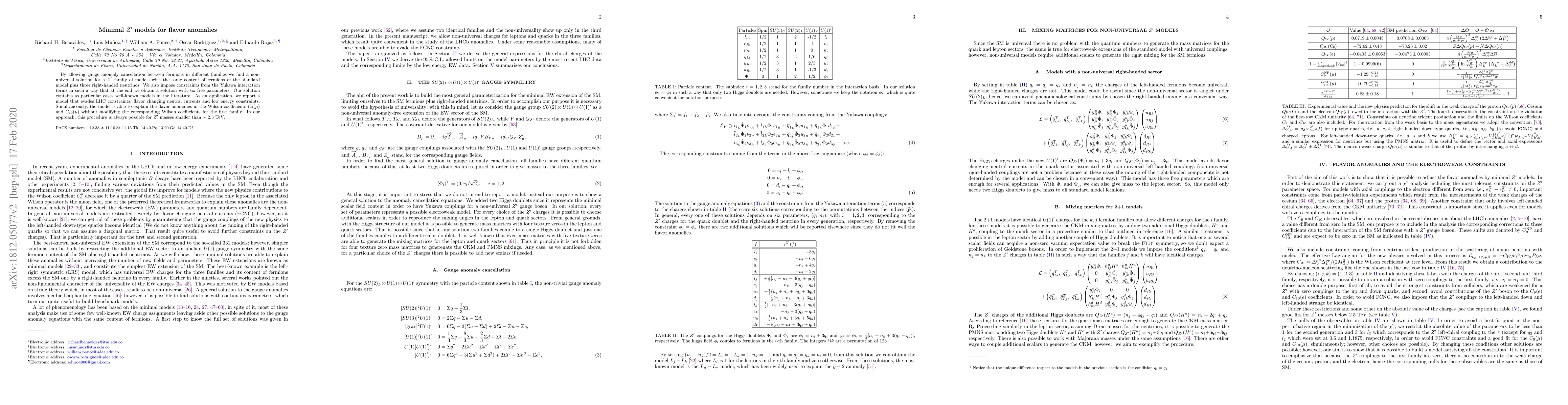 By allowing gauge anomaly cancellation between fermions in different families we find a non-universal solution for a $Z'$ family of models with the same content of fermions of the standard model plus three right-handed neutrinos. We also impose constraints from the Yukawa interaction terms in such a way that at the end we obtain a solution with six free parameters. Our solution contains as particular cases well-known models in the literature. As an application, we report a model that evades LHC constraints, flavor changing neutral currents and low energy constraints. Simultaneously, the model is able to explain the flavor anomalies in the Wilson coefficients $C_9(\mu)$ and $C_{10}(\mu)$ without modifying the corresponding Wilson coefficients for the first family. In our approach, this procedure is always possible for $Z'$ masses smaller than $\sim 2.5$~TeV.