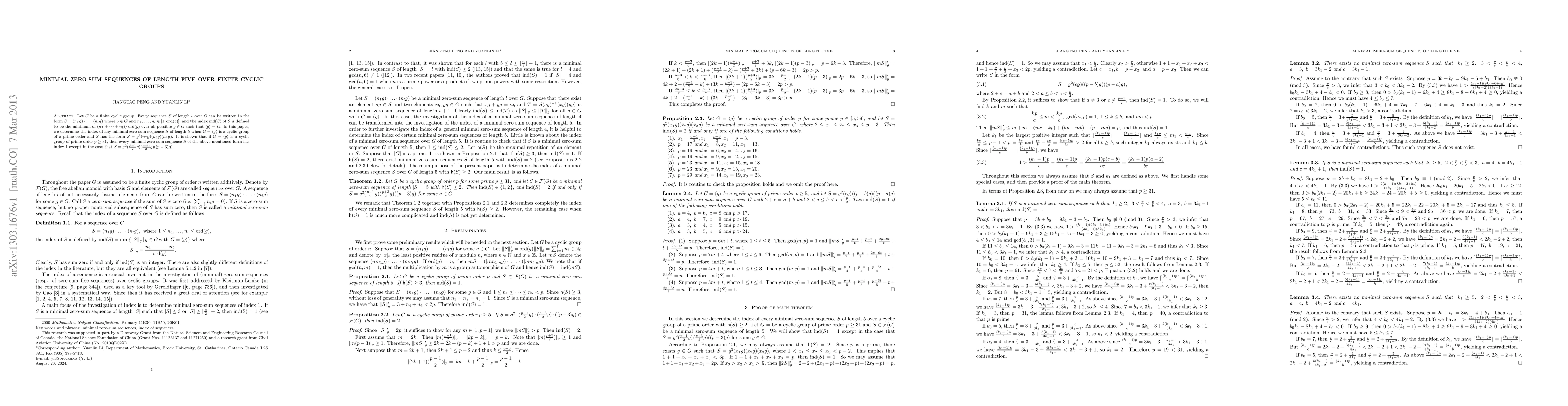 Researchers studied minimal zero-sum sequences of length 5 over finite cyclic groups, finding that for prime orders p >= 31, most sequences have an index of 1, except a specific sequence with a unique form.