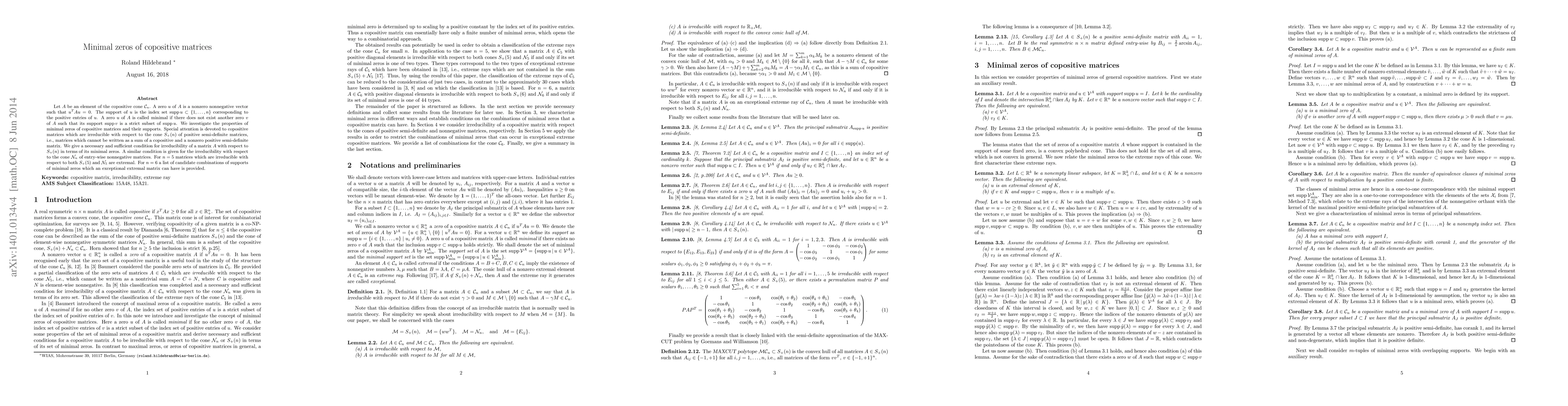 This paper explores the properties of minimal zeros of copositive matrices, defining minimal zeros as those with no smaller support among zeros of the matrix. It provides necessary and sufficient conditions for the irreducibility of copositive matrices concerning positive semi-definite and entry-wise nonnegative matrix cones, and presents specific results for matrices of dimensions 5 and 6.