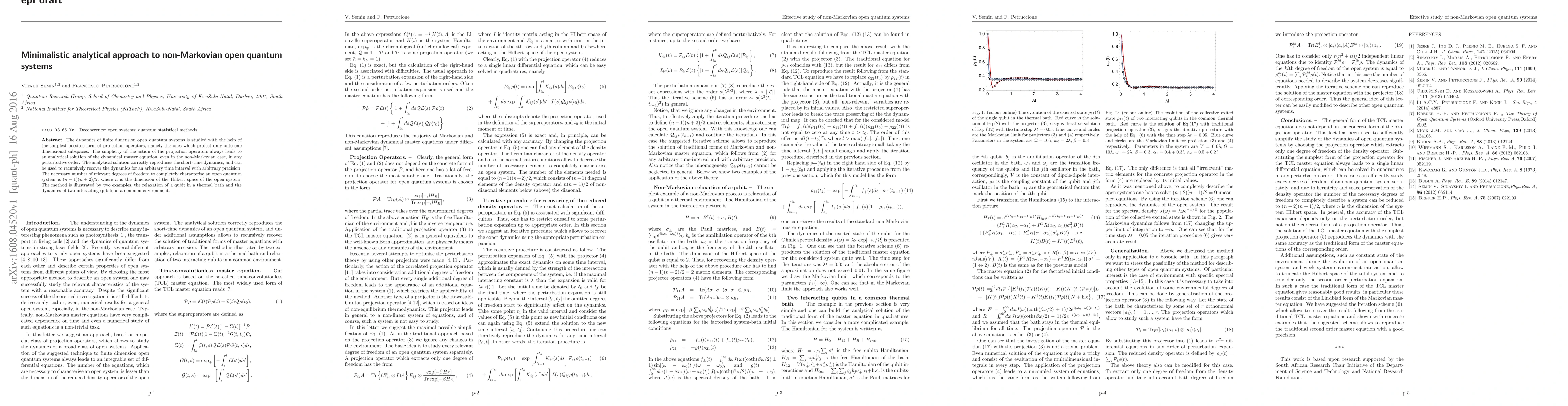 This paper presents a minimalistic analytical method for studying non-Markovian dynamics in finite-dimensional open quantum systems using one-dimensional projection operators, yielding an exact analytical solution to the master equation. The method accurately captures short-time dynamics and can recursively recover dynamics for any time interval with high precision.