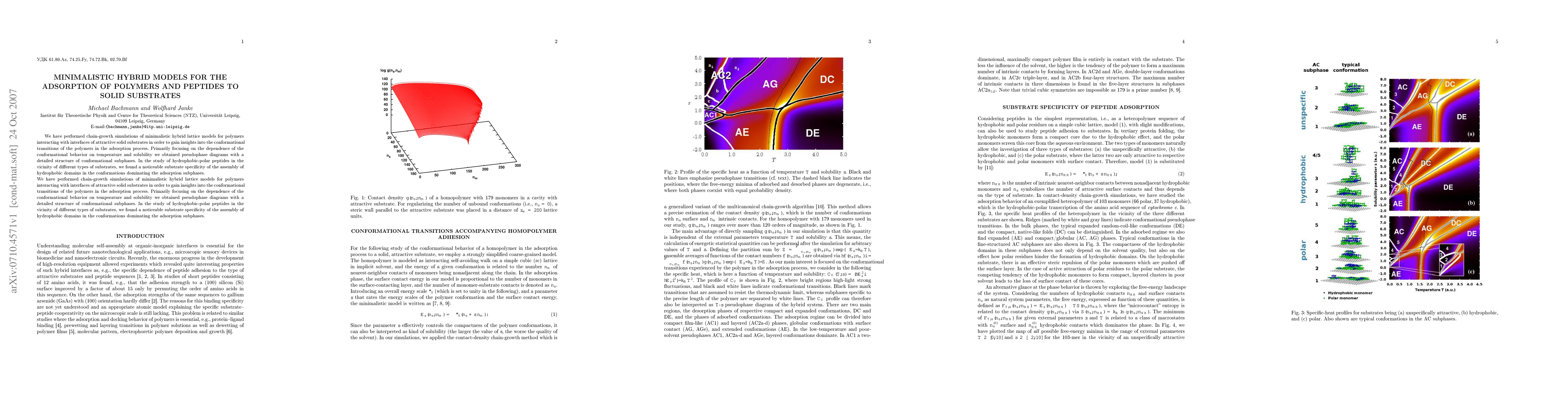 This research investigates minimalistic hybrid lattice models to simulate polymer and peptide adsorption on solid substrates, revealing conformational transitions influenced by temperature and solubility. It also highlights substrate specificity in the assembly of hydrophobic domains in peptide adsorption.
